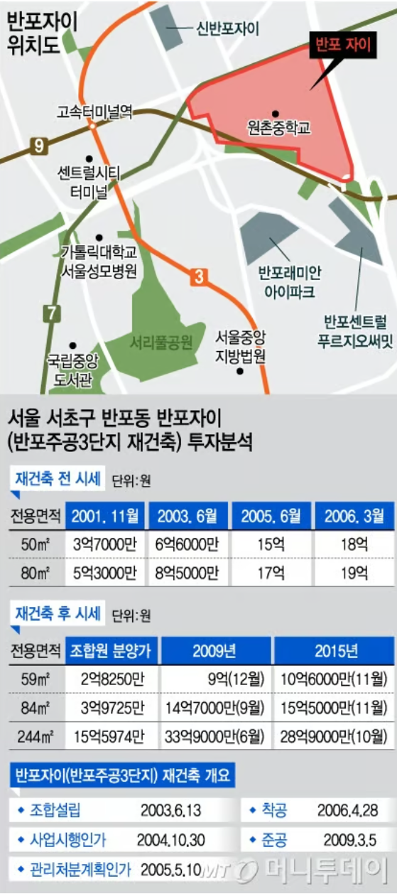 얼마 지나지 않아 아파트 여기저기엔 조합설립과 관련한 현수막이 걸리기 시작했고 내가 군에 입대할 2003년 즈음 주택조합이 설립되었다. 이후 사업시행 및 관리처분계획 인허가를 통과하고 2008년 12월부터 아파트 입주가 시작되었다. 그런데 2009년의 부동산 분위기는 그리 좋지 않았다. 그 이유는 2008년 리먼브라더스 파산과 금융사 연쇄도산, 부실채권으로 인한 글로벌금융위기가 발생하면서 부동산 경기도 짜게 식던 시기였다. 그럼에도 불구하고 반포 자이는 일반분양 평당 가격이 3,200만 원 수준을 보이며 초고가 분양 논란이 일 정도였으니 그 인기는 대단하였다. 용감한 투자자들의 선택은 틀리지 않았고 당시 아파트를 매입한 사람들은 돈방석에 앉게 되었다(반포자이 35평형 A타입 최근 실거래가 39억 7천만 원, 2024년 7월 기준).