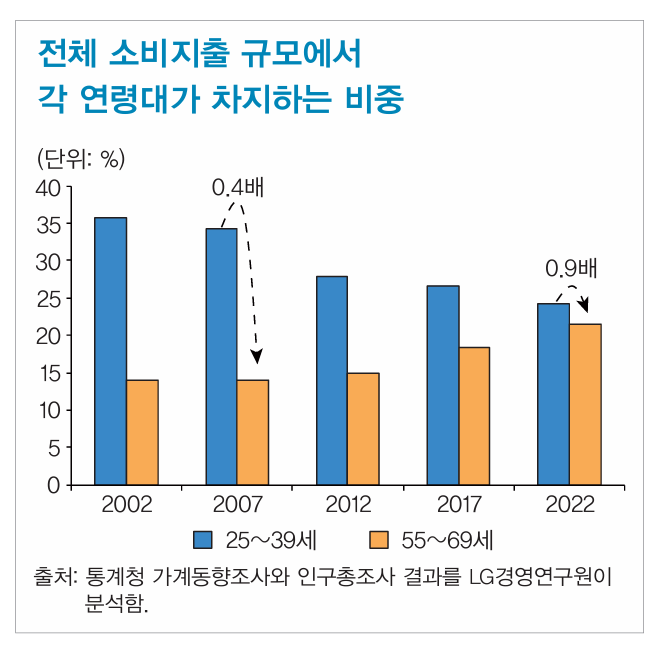 동 연구원에서는 조건이 비슷한 가구들의 지출규모를 비교하여 구성원의 특성에 따른 평균적인 소비규모를 추측해 보았는데 매해 25~39세의 소비규모가 줄어드는 반면 55~69세의 소비규모는 늘어나고 있다. 코로나 이후 비대면 소비가 증가하면서 MZ세대의 소비에 대해 집중 조명하며 시장의 주요 세대로 로 생각했지만, 실상은 시니어 세대의 소비가 점점 늘어나고 있는 것이다. 고령인구의 증가와 평균수명의 증가 그리고 50대 이상 세대의 부의 집중 등으로 인해 이러한 추세는 점점 더 심화될 것으로 예상된다.