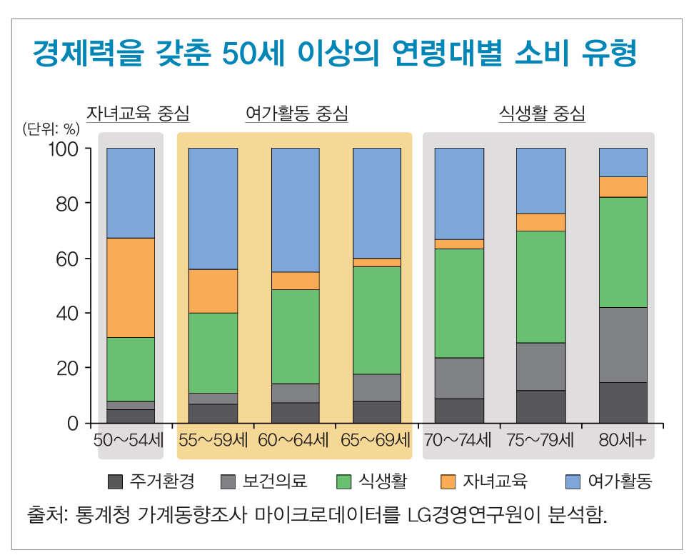 LG경영연구원에서 지난해 발표한 자료에 의하면 은퇴시기 경제력을 갖춘 50세 이상의 연령대별 소비 유형이 변화하고 있음을 보여 준다. 일반적으로 자녀가 성장하는 시기(3040)에는 교육비에 많은 비용을 투자하지만, 자녀가 성인이 되어서부터는(5060) 본인의 여가활동에 중심을 둔 소비를 보여 준다. 과거의 시니어 세대와 비교를 해보면 확연히 달라진 결과이다. 경제적 여유가 있어도 절약하고 자녀의 결혼까지 지원하는데 집중하던 것에서 나 중심의 투자와 소비로 변화한 것이기 때문이다.