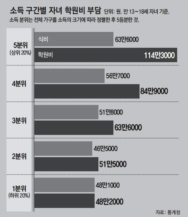 만약 사교육이 실제 자녀들의 대학입시 결과와 무관한 결과를 가져온다면 혹은 어떤 대학과 학과를 나오더라도 사회적으로 큰 격차 없이 살아가는 세상이라면 줄어들지도 모른다. 하지만, 실제로 서울 강남구 출신 학생들이 서울대 입학생의 12%를 차지한다. 사교육을 많이 받으면 좋은 대학에 들어갈 수 있다는 것이 반증되는 결과이다. 또한, 소득분위에 따른 사교육비 지출 통계결과를 보면 그로 인한 양극화는 앞으로 더욱 심해질 것 같다.