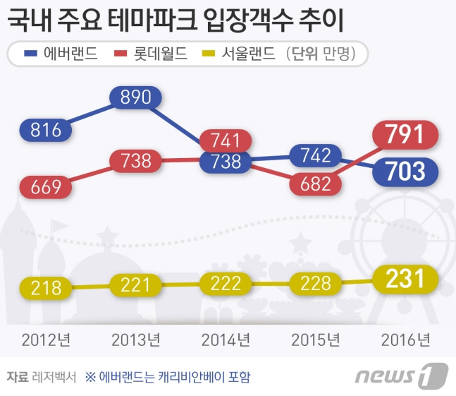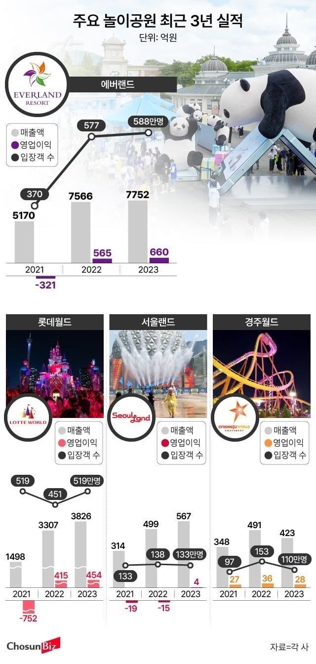 서울랜드를 자주 가다 보니 문득 궁금해졌다. 저출산 이슈가 꽤 오랫동안 시끄러운데 과연 영업이익이 잘나고 있을까? 평일에 가보면 꽤나 한산한데 최근 코로나 이슈가 해소되며 외부활동이 늘어난 효과를 보고 있을까? 등의 생각과 함께 기사를 찾아보았다. 주요 놀이공원인 에버랜드, 롯데월드, 서울랜드의 매출액은 지난 3년 동안 점점 늘어나고 있다. 빅 3 중에서도 시장 1위인 에버랜드는 팬더곰 푸바오 덕을 크게 보았다고 한다. 롯데월드의 경우 한국에 방문하는 외국인 관광객들이 증가하며 활기를 되찾고 있는 것으로 보인다(한 때는 롯데월드 외국인 관광객이 전체 방문객의 10%를 기록하기도 하였다). 하지만, 지난 3년 동안 꾸준히 영업이익을 낸 부울경 지방의 자존심 경주월드의 경우 추세상 입장객 수가 꺾여 가는 것을 보니 지방소멸 현상과 더불어 앞으로가 더 힘들 것이예상된다.