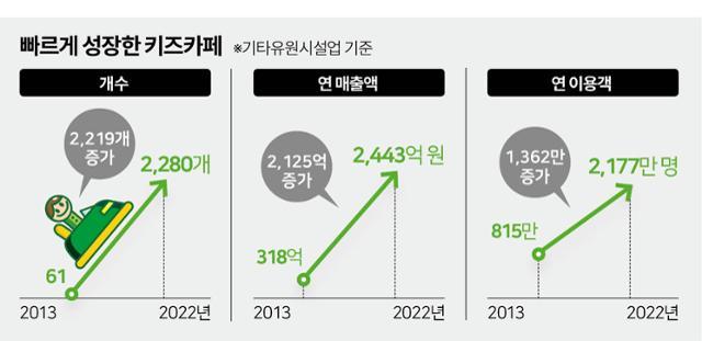최근 기사를 찾아보니 저출산과 인구고령화에 발맞춰 에버랜드는 실버세대(고령층)를 위한 정원과 산책로 등을 추가로 마련하고 있으며, 연간회원권 가격 역시 일반성인에 비해 고령자는 반 이하(일반성인 29만 원, 60세 이상 고령층 13만 원) 가격으로 구매가 가능하다고 한다. 물론 이러한 접근만으로는 늘어나는 고령층의 방문을 획기적으로 늘릴 수 있다고 생각되진 않는다. 장소 자체가 대부분 유소년층과 젊은 가족단위의 방문에 포커싱 되어 있어 고령층이 방문했을 때 누릴만한 것이 특별히 없다. 하지만, 골드키즈 및 텐포켓키즈(식스포켓에서 텐포켓까지 가열차게 늘어나는 주머니...)로 불리는 지금의 영유아들에게 과거에 비해 주머니를 열 수 있는 사람들이 많다는 것은 희망적이다. 실제로 놀이공원의 축소판이라고 할 수 있는 키즈카페는 저출산 시대에도 접근성이 좋고 비교적 저렴한 가격을 앞세워 빠르게 성장 중이다. 60대 이상 조부모로 추정되는 소비자의 2022년에서 2023년 동안 업종별 카드결제액 증가율을 보면 키즈 관련한 사업장이 급격히 증가하고 있음을 알 수 있다. 결국 놀이공원 산업의 키를 쥐고 있는 핵심 소비자는 영유아 및 초등학생을 키우고 있는 부모와 그들의 부모인 조부모로 압축될 것으로 보인다. 그에 따라 앞으로는 조부모와 함께 즐길 수 있고 쉴 수 있는 프로그램, 놀이기구, 공간 등이 더욱 늘어날 것이라고 예측해 본다.
