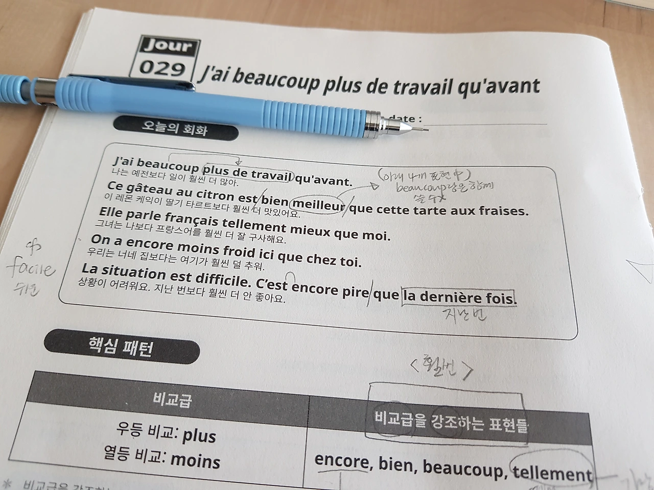 plus도 s가 발음이 되지 않다가 동사의 비교급 활용에 와서는 갑자기 마지막에 붙는 -s가 발음이 된다고 했을 때의 그 당혹감이 지금도 기억에 선하다. meilleur는 여성/남성/복수로 변형하는데 여전히 익숙하지가 않아서 그런지 자꾸 plus bien/bon으로 표기해버리는 오류를 반복하고 있다.