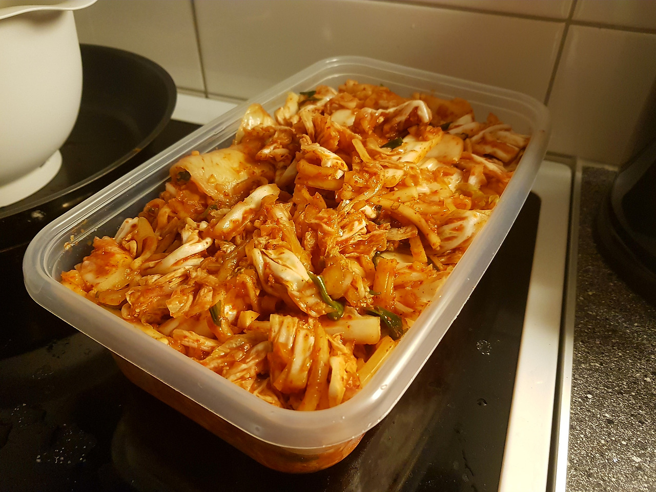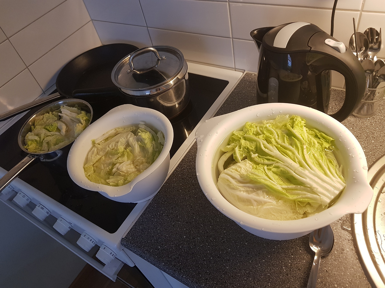 드디어 참다못해 유학 온 지 석 달만에 생애 첫 김장을 했다. 배추김치 한 포기면 한 달 반(매일 먹었습니다)은 가는 것 같다. 일일장터에서 산 배추 한 포기를, Alfo에서 산 굵은소금에 절여 반나절 넘게 재워두고, 양파, 마늘, 대파, 채썰기 한 무, 한국서 가져온 새우젓과 고춧가루, 전분 대신 짓이긴 밥풀을 넣고 섞어서 양념을 준비해 둔다. 적당히 숨이 죽은 김치를 꺼내서 (소금을 적게 썼고 까나리액젓이 없어서 싱거운 편이었기 때문에 김치를 물에 헹구는 과정을 생략했다) 바로 양념과 섞는다. 김장할 통이 없어서 배추를 잘게 자른 뒤 양념을 섞는, 막김치에 가까운 김장(?)을 했다. 이렇게 금방 만들면 비슷한 맛은 나지만 숙성이 안 돼 맛이 없다. 하루 꼬박 상온에 둔 뒤 다음날 수업을 다녀와서 냉장고에 넣었더니 다음날 적당히 발효가 돼 상큼하고 시원한 그 김치 특유의 풍미가 났다. 방 안엔 온통 새우젓 냄새가 가득하고 전날 마늘을 까면서 손에 냄새가 배이는 바람에 향수를 엄청 뿌리고서 수업을 들으러 갔다. 일회용 장갑이 필수일 듯하다.