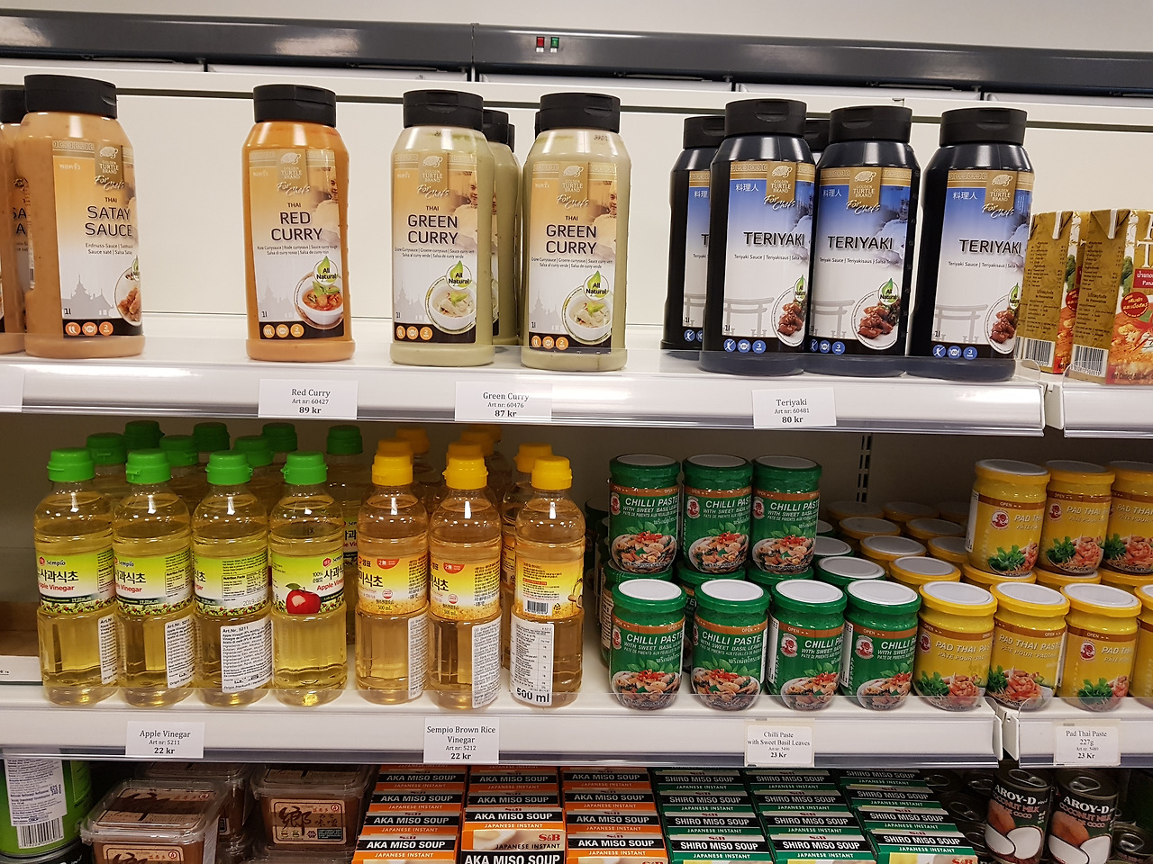 '여의'에는 한국 과자(바나나킥 13Kr, 알새우칩 15Kr, 자갈치 11Kr)나 신라면, 불고기양념 42Kr, 김밥용 김 32Kr, 돌김구이 55Kr, 일본 된장(미소), 고추장 23Kr, 김치(작은 병에 든 것으로 ICA에서도 팔지만 한국회사에서 만든 것인데도 현지화되서 달고 맛이 없다. 직접 김장을 하느니만 못한 맛)도 판다.