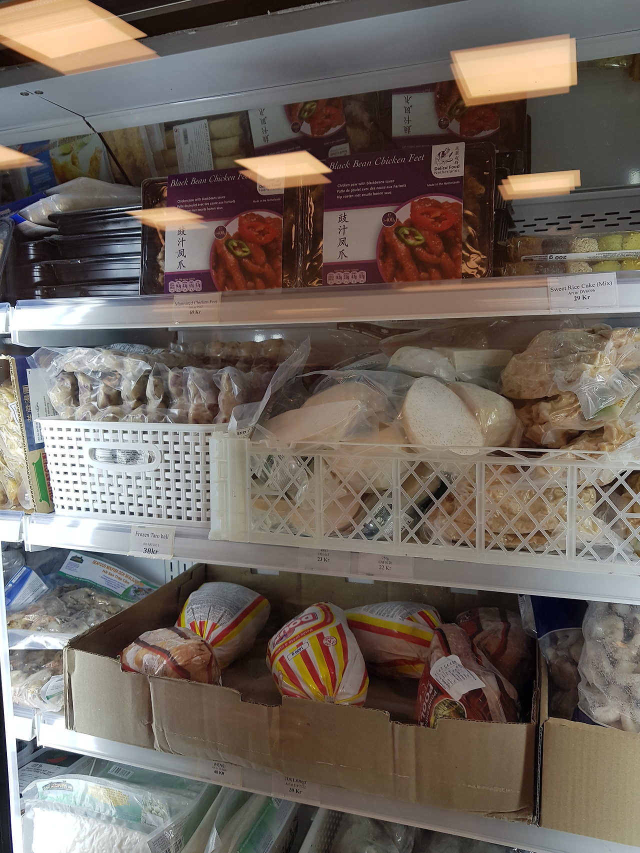 죽순, 새우, 팽이버섯, 가재, 심지어 아래 사진처럼 중국서 들여온 닭발 69Kr도 팔고 있었다. 닭발 옆으로 떡 29Kr이 보인다. 마늘의 경우, ICA나 일일장터, 아시안마켓에서는 다듬지 않고 통째로 팔지만 Alfo의 경우 깐마늘을 대용량으로 진공포장해 파는데 편리한 대신 수작업이 포함되선지 비쌌다.
