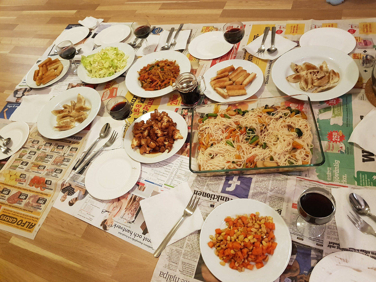 평소 입이 짧은 편인데도 요즈음은 늘 습관적으로 뭔갈 먹고 있다. 위 사진은 친구 A의 생일파티 때 찍은 사진인데, 각자 요리를 한 뒤 가져와서 펼쳐놓고 먹는다. 이 날도 폭식을 했다. 낮의 길이가 극단적으로 짧은 이 나라 겨울의 특성과도 관련이 있는 것 같다. 8월에는 오후 8시 30분쯤 돼서야 뉘엿뉘엿 지던 해가, 10월까지만 해도 참을 만하더니 11월이 되니 오후 5시에 떨어졌다. 12월이 되니 오후 3시면 창 밖이 새벽 3시를 연상시킬 정도로 캄캄하다. 반대로 아침 해는 참 더디게 뜨기 때문에 일어나기가 더 힘들다.
