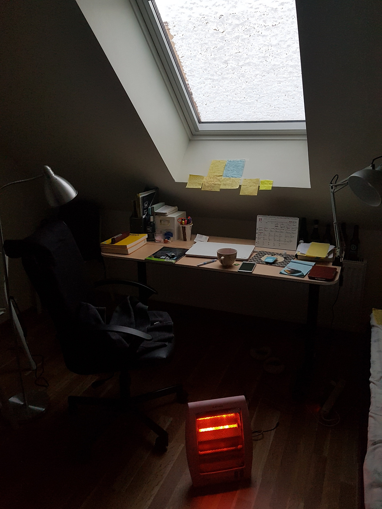 나에겐 한국에서 가져온 미니 전기히터가 있는데 물론 효과는 있었다. 하지만 공부할 때 책상 밑에 두고 쓸 때는 문제가 없지만 방 전체를 덥히기엔 한계가 있다. 불가에 가까이 갔을 때만 따뜻하기 때문에 자연히 운동도 안 하게 되고 활동성이 떨어지게 만들었다.