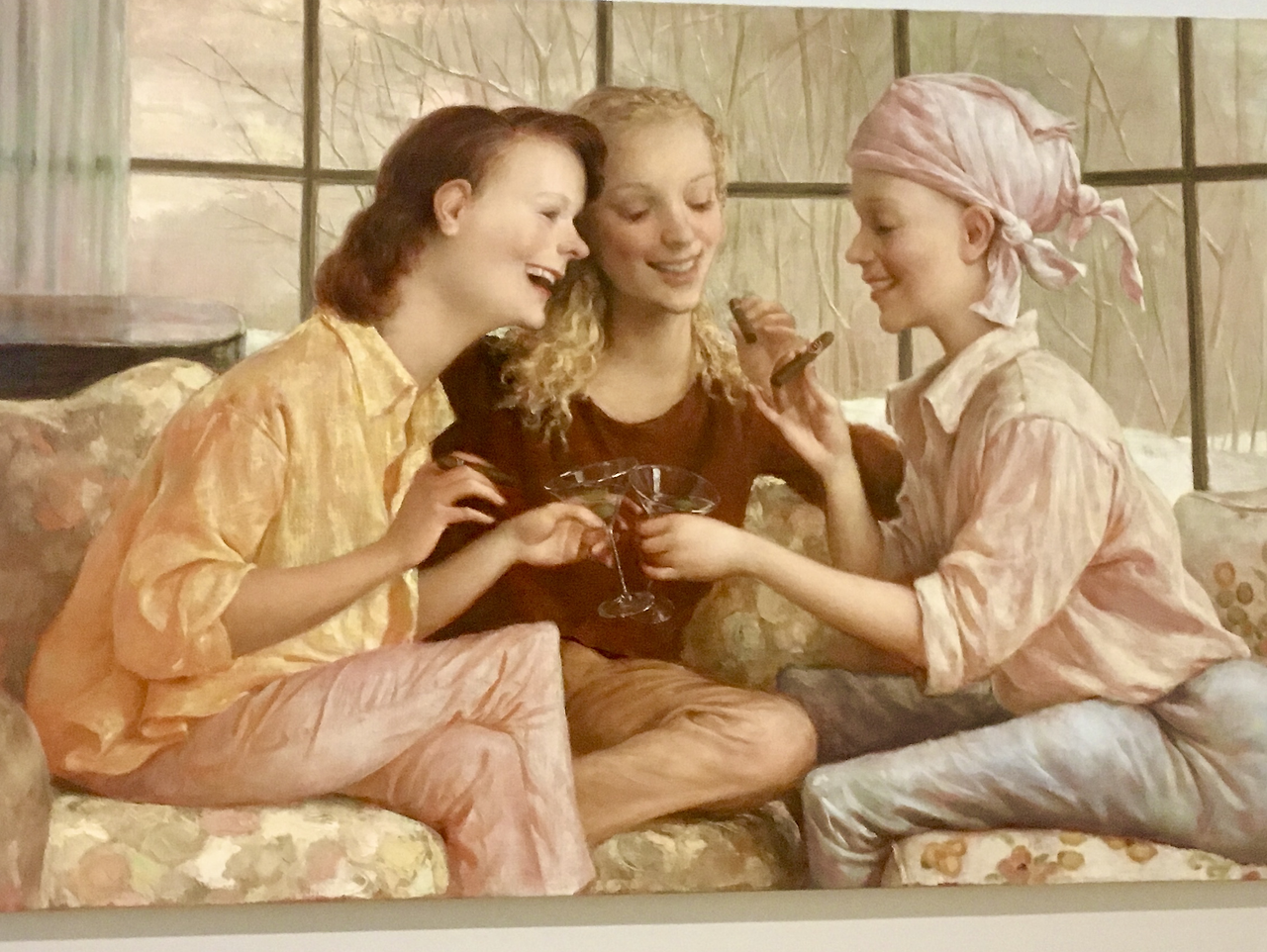 그를 만난 그때로 돌아가보자. <스탬퍼드 에프터 브런치>는 코네티컷 스탬퍼드에 있는 존 커린의 집에서 식후 낮술로 마티니를 마시는 갤러리스트 새디 콜스, 안드레아 로젠, 숀 레건을 그린 작품이다. 밝고 화사한 의상과 소파에 사로잡혀 이 언니들이 시가를 들고 있다는 건 미처 보지 못했다. 음, 사실 난 작품을 감상한 게 아니라 촬영만 열심히 한 듯 하다.