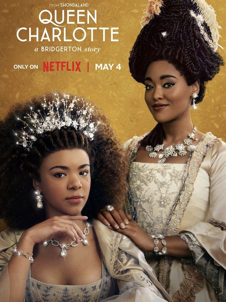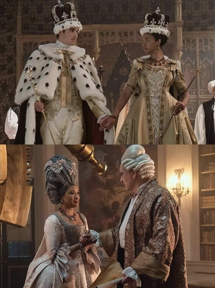 외국인 퀸 샬럿이 시집와야 했던 이유가 있었다. 그러니까, 실제로는 그녀(조지 3세의 왕비)가 갈색피부는 아니었겠지만 드라마에서는 독일 지역의 그리 힘이 없는 나라 출신인 샬럿 공주가 피부도 피부지만 어마무시한 곱슬머리를 가지고 시집온다.