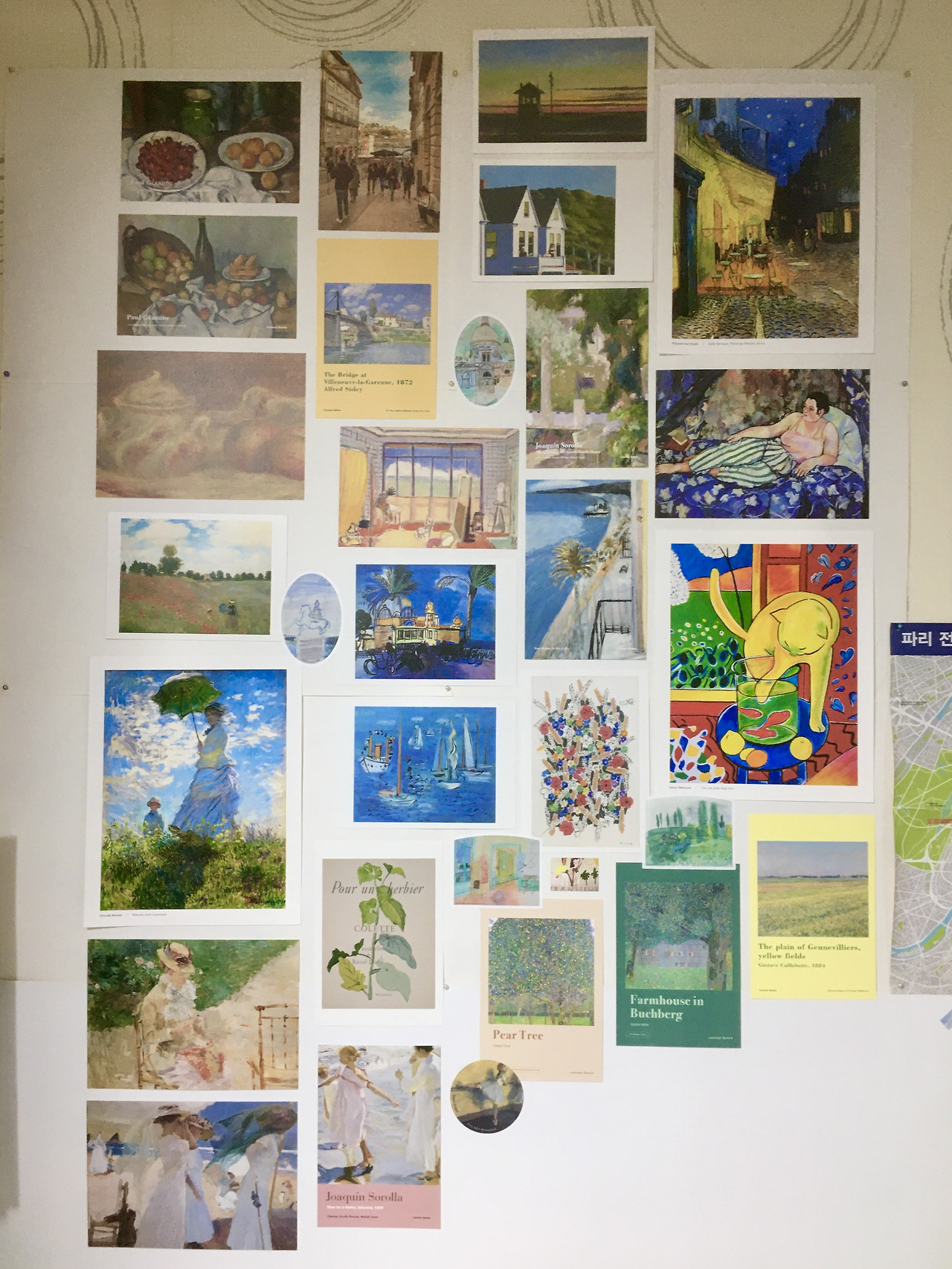 엽서 매대에서 '사과' 정물화 두 점과 함께 알프레드 시슬레, 앙리 마티스, 구스타브 클림트 등을 챙겼고 동시에 여러 그림을 보고 싶어서 엽서 인테리어를 연구한 끝에 나만의 콜라주가 완성됐다. 마티스와 뒤피가 센터를 차지했지만 마티스 고양이위에는 수잔 발라동이 여유롭게 늘어져 있고 고개를 들지 않아도 보이는 노출존에는 베르트 모리조와 호아킨 소로야 그리고 에드가 드가의 스티커가 있다.