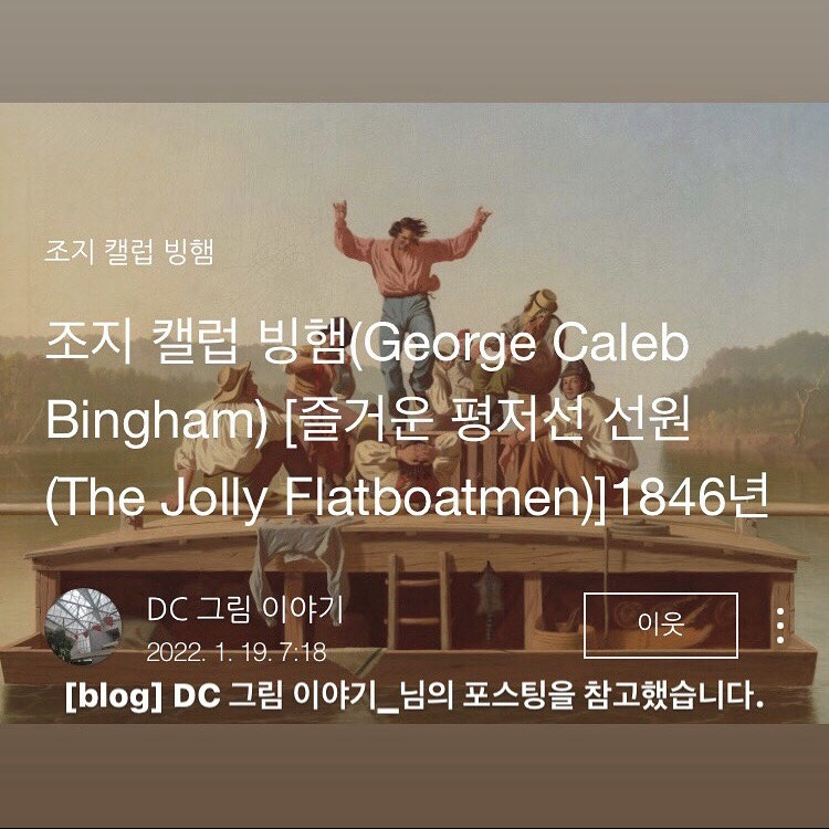 직관한 두 개의 대표작을 중심으로 이와 관련된 그림을 이 블로그에서 다운로드하여 첨부했다. 조지 칼렙 빙엄이 서부개척 시대에 그린 강 풍경화 전체에 대한 정보는 바로 이 블로그 <DC 그림 이야기>를 통해 한국어로 편하게(!) 볼 수 있다. 네이버 지식백과의 안팎에 있는, '디지털 문서화 작업이 된' 국내에서 출판된 백과사전류의 모든 자료*를 검색해도 이 블로그만큼 모든 정보를 다루고 있지는 않았다.