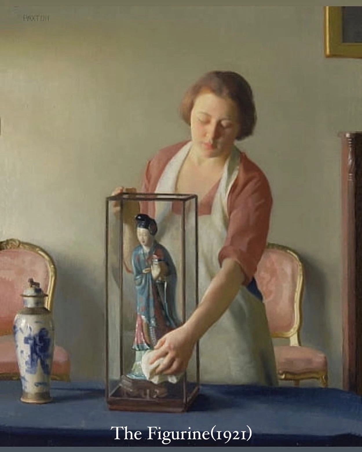 이어서 <꽃꽂이 하는 소녀>가 등장하는데, 이번에는 도자기가 없고 인테리어의 강조색이 레드와 퍼플이네요. 팩스턴의 색감을 잘 드러내는 그림이기도 하지만, 저는 이 꽃꽂이 소녀가 그와 어떤 관계인지도 궁금해져요. 다음 그림에 도자기 피규어를 닦고 있는 하녀가 등장하는데, 일단 꽃꽂이 소녀랑 똑같이 생겼거든요. 이 여성은 누구일까요?
