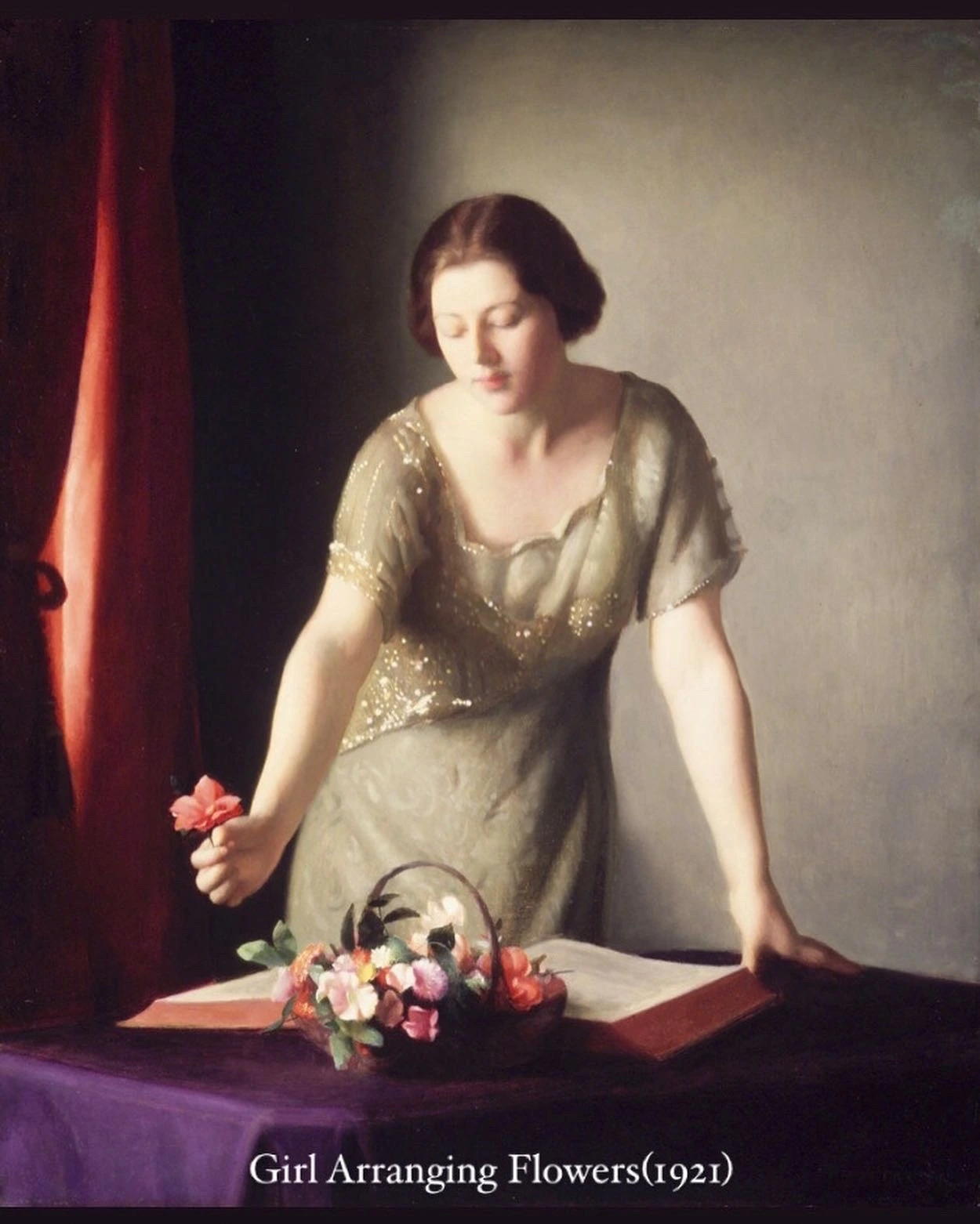 이번에는 <초록 드레스>를 입은 여성이 피규어를 응시하고 있는데, 배경은 전체적으로 다크톤이지만 뒤에는 팩스턴이 자주 그리는 도자기가 있고 앞에는 의자 위로 초록 드레스를 입은 여성의 코트로 보이는 옷이 흘러내리고 있어요. 귀부인이지만 아까 그 소녀가 닦고 있던 피규어를 보고 있는 그녀는 또 어떤 관계일까요? 팩스턴이 피규어를 갖고 다니면서 같이 그리게 한 것일까요?