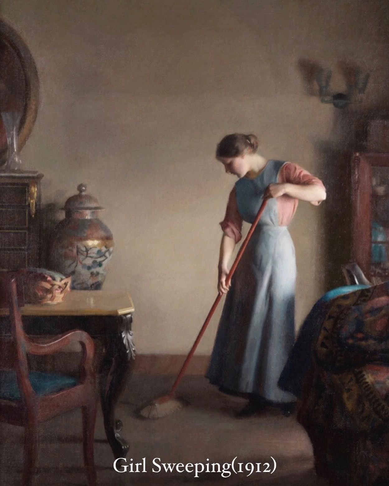 저는 다시 그의 시그니처로 돌아올게요. 도자기가 있는 방을 청소하고 있는 하녀를 그린, <비질하는 소녀>입니다. 그녀의 옷과 그녀가 청소하는 방의 인테리어 모두, 팩스턴의 시그니처인 블루와 피치 컬러로 하나가 되어있어요. 소품의 특성 또는 명암 차이에 의해 배경은 톤다운된 청록색과 브론즈가 많이 보이지만, 마치 이렇게 인테리어가 된 방에서 그릴 것이니 이런 옷을 입으라고 스타일링을 해준 것 같지 않나요?