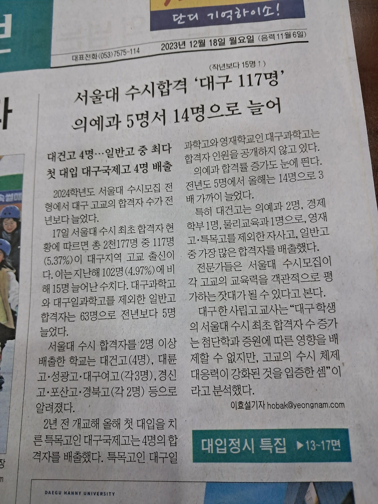 #2024수시 #서울대수시합격 #대구117명 #작년보다15명증가 #일반고인 #대건고 #의예2명경제1명물리교육1명