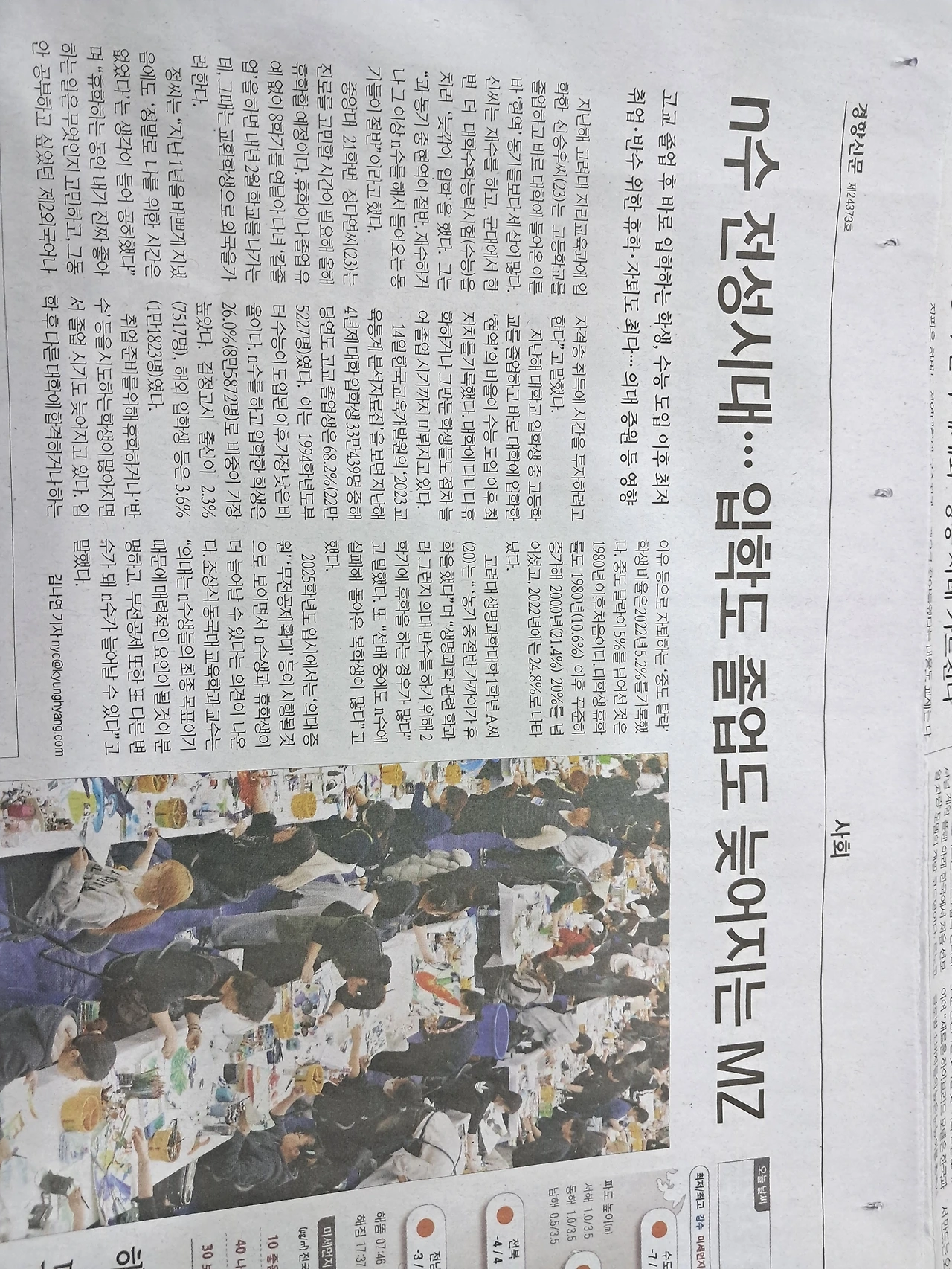 #n수전성시대 #입학도졸업도늦어지는MZ #고교졸업후바로입학하는학생 #4년제대학입학생33만439명중 #해당년도고교졸업생은68.2% #22만5227명 #절박한재수생 #취업 #반수를위한휴학 #자퇴도최다 #의대는n수생들의최종목표 #의대증원 #매력적인요인될것 #무전공제또한다른변수 #n수증가예상