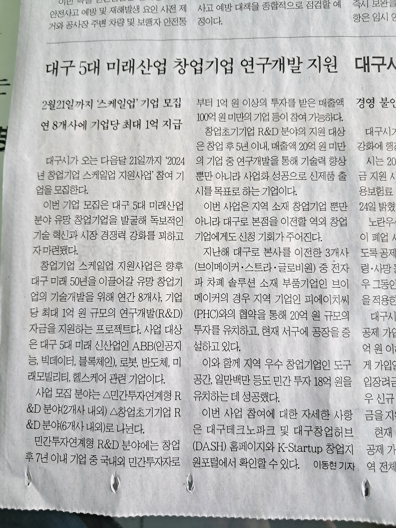 #대구 #2024년 #창업기업 #스케일업 #참여기업모집 #5대미래산업 #유망창업기업발굴 #독보적기술혁신 #시장경쟁력강화코자 #연간8개사 #최대1억원R&D자금지원프로젝트 #AI #빅데이터 #블록체인 #로봇 #반도체 #미래모빌리티 #헬스케어 #민간투자형D&D분야 #창업초기사업분야 #대구로본점이전할역외기업도신청기회부여 #2023년 #브이메이커 #스트라 #글로비원 #해당됨 #전자파차폐솔루션소재부품기업인 #브이메이커 #지역기업인PHC와협약 #20억투자유치 #대구서구공장증설중 #도구공간 #일만백만등 #민간투자18억원유치성공 #대구테크노파크 #대구창업허브 #DASH #K-Startup #문의
