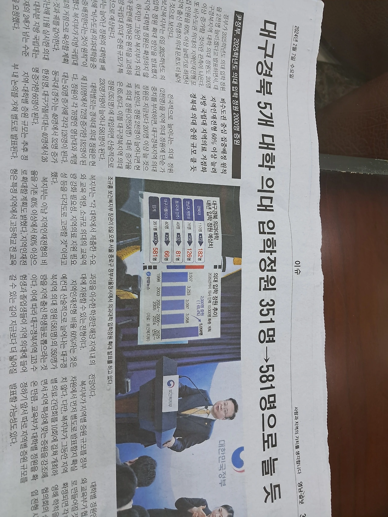 #보건복지부 #의대증원확대방안발표 #2025학년도입시부터 #2천명증원 #현3천58명에서 #5천58명으로증가 #의료취약지구의사인력확보 #고령화등의료수요부합하기위해 #SKY대이공계열 #카이스트포스텍등 #경북대등지거국립대 #우수인재다수 #의대로연쇄이동가능성증가 #현재진행형인의대쏠림현상 #의대진학반수재수삼수생증가예상 #지역민반응 #소아과오픈런해소기대 #의료질저하우려 #대구경북지역의대증원 #200명이상증가예상 #경북대의대 #현110명 #182명으로증원 #증원규모고려사항 #각대학이제출한수요와교육역량 #소규모의대교육역량강화필요성 #지역의료지원필요성 #지역인재전형비율60%확대계획 #지역특성에맞는증원재차강조 #한국대학교육협의회승인거쳐시행계획 #영남일보