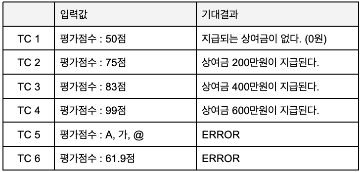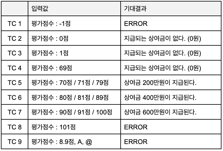 평가 점수에 따른 상여금 지급 시스템을 등가분할을 사용하여 TC를 작성해보겠습니다.