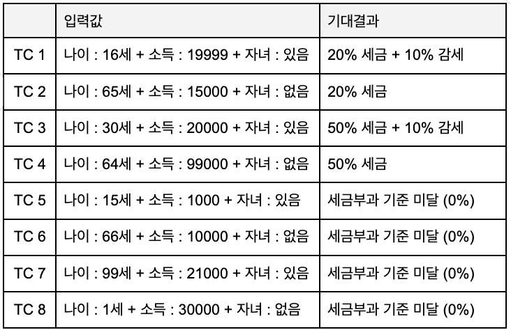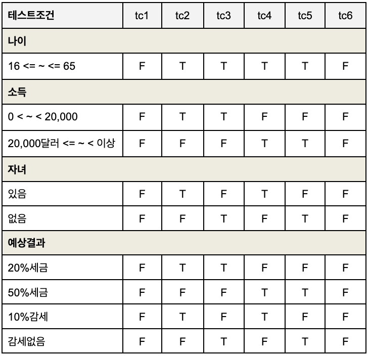 세금 지불에 대한 테스트를 위해 결정테이블 테스팅을 사용하여 TC를 작성해보겠습니다.
