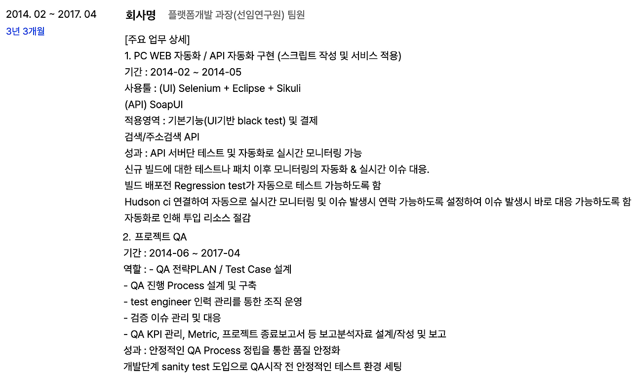 ▶︎ 경력 사항 : 지원하는 포지션과 연관된 경력을 최신순으로 작성한다. 내용에는 '회사명, 근무기간, 최종부서와 직급, 업무 경력'을 작성한다. 특히 업무 경력 기술시, 같은 내용을 반복하여 작성하지 않도록 유의하는 것이 좋다. 예를 들어, 테스트케이스 작성/기능 테스트 수행/결함 관리와 같은 QA 기본 업무를 회사별, 프로젝트별로 반복해서 기입할 필요는 없다.