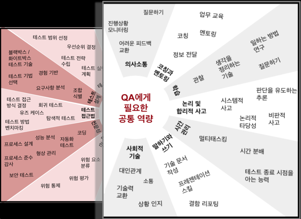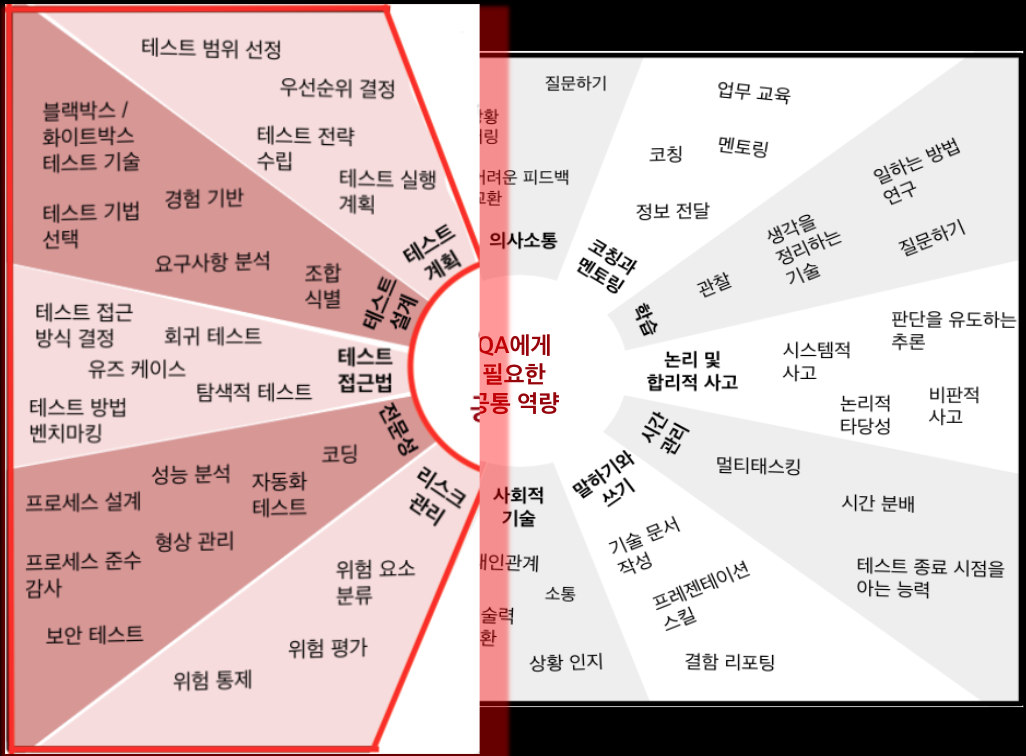 스킬맵의 구성을 먼저 살펴보면, 화면의 왼쪽에 붉은 계열로 표시된 범위가 QA에 요구되는 전문적인 기술 역량을 나타내고, 회색 범위가 QA로서 갖추어야 할 자질과 태도에 해당됩니다