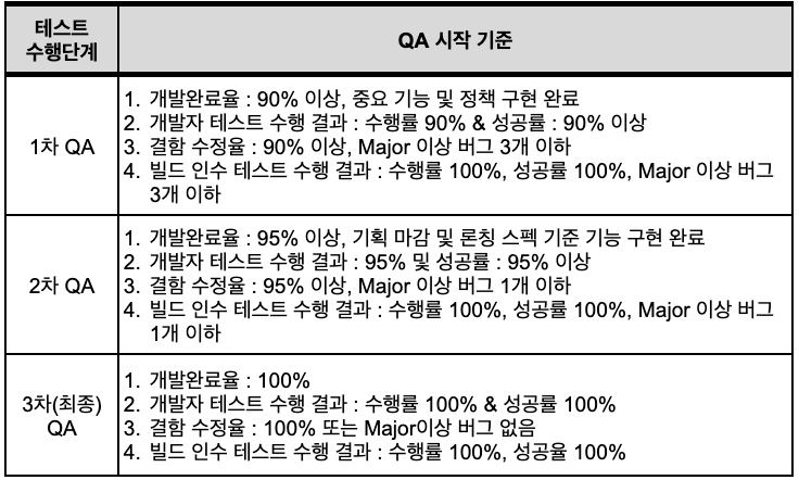 제품 출시를 위한 오픈 가능한 품질 목표 기준을 설정하여 Fail시 출시 일정을 지연하거나 추가 테스트 일정을 조율합니다.