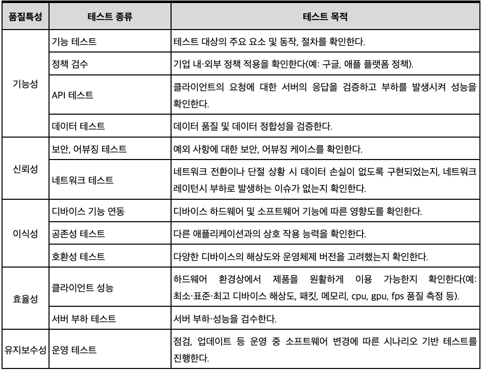 ▶ 테스트 유형 : 기능 테스트, 성능 테스트, API 테스트, 네트워크 테스트 등 선정
