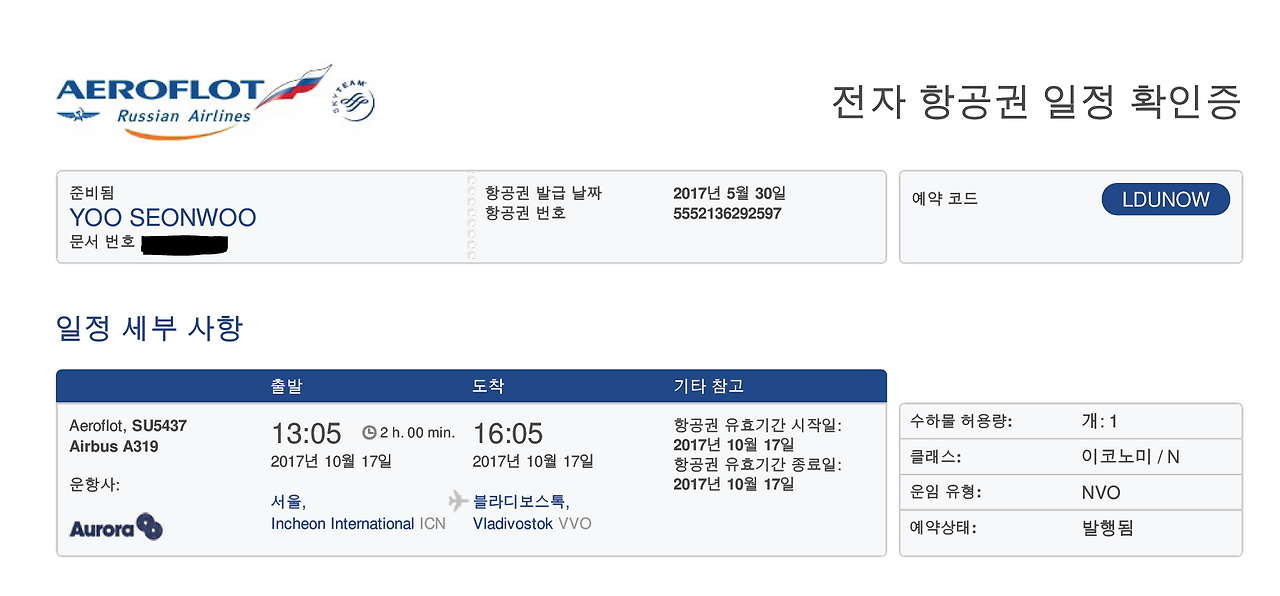5월 중에 블라디보스톡 행 비행기를 예매했다.