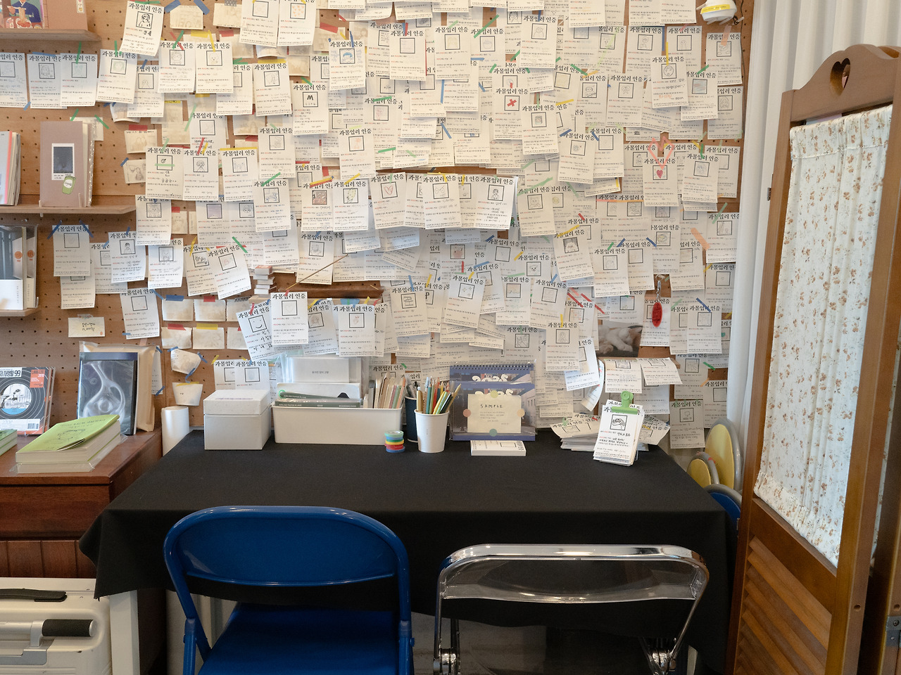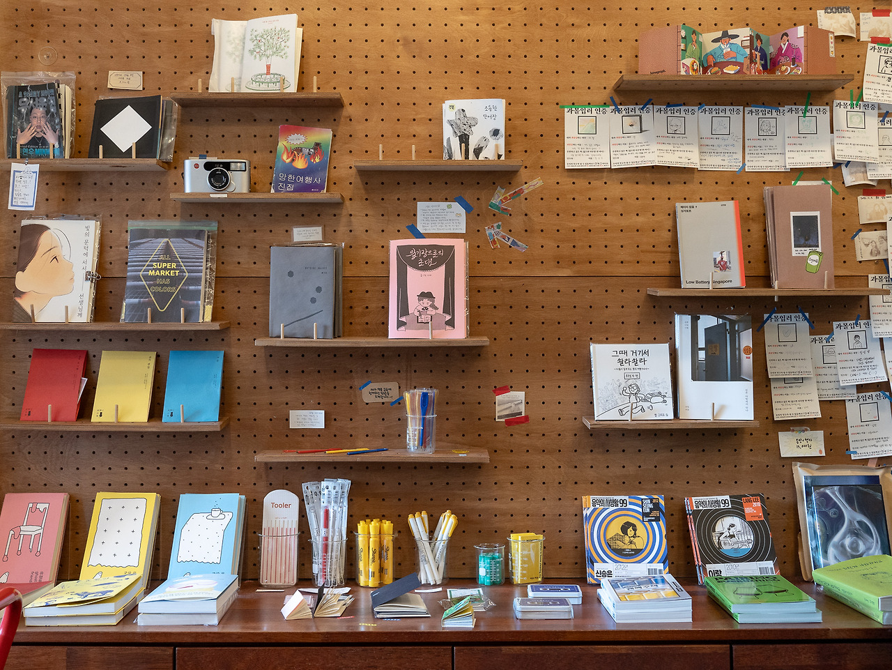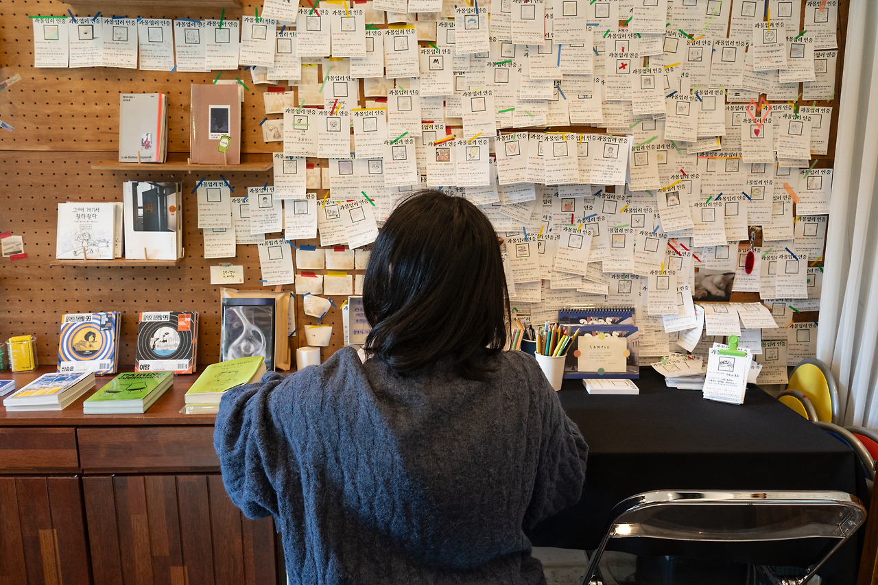 욱: 저희 목표는 사람들이 '머무는 시간'을 늘리는 거였어요. 처음엔 '아트박스'를 레퍼런스로 삼았어요. 아트박스는 꼭 필요한 물건을 사러 가는 곳이라기보다는 구경하면서 시간을 보내는 곳이잖아요. 이곳도 그런 느낌을 주고 싶었어요. 공간이 좁아 금방 둘러보고 나갈 수 있기 때문에, 참여형 프로그램을 많이 마련해 사람들이 한 가지 활동에 집중하거나 책을 읽으며 오래 머물 수 있도록 했고요.
