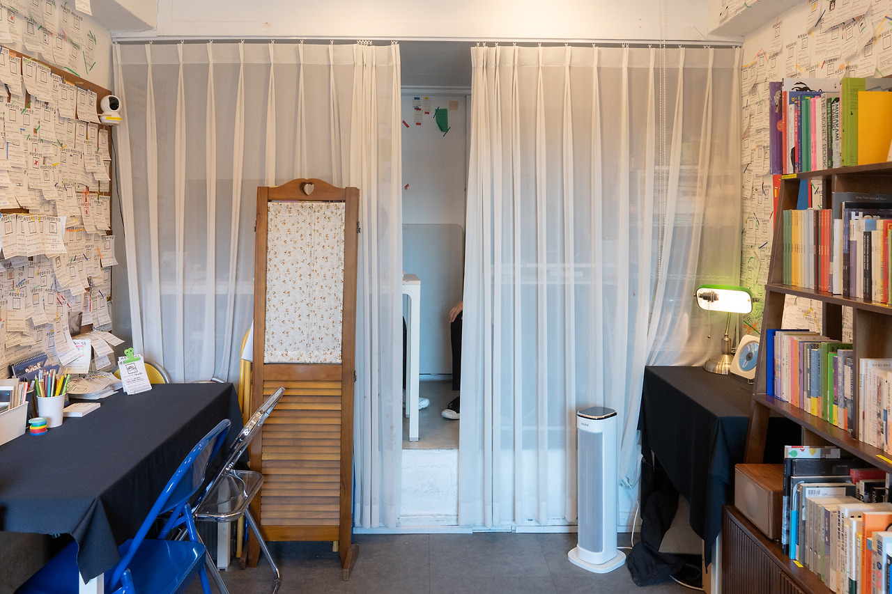 커튼을 설치한 것도 바로 그런 이유예요. 고객분들이 저희를 의식하지 않고 공간을 자유롭게 둘러볼 수 있게 하기 위함이었거든요. 저희가 지켜보고 있다는 느낌을 받으면 의도하지 않았더라도 손님들이 부담스러워할 수 있으니까요.