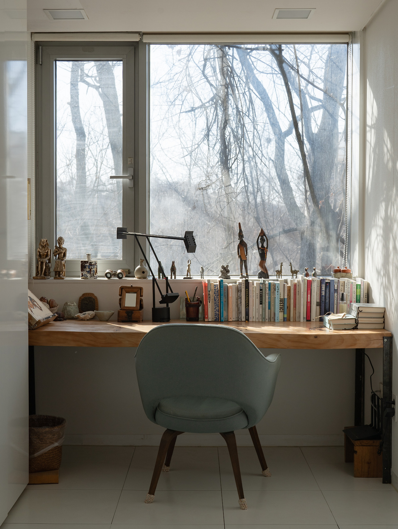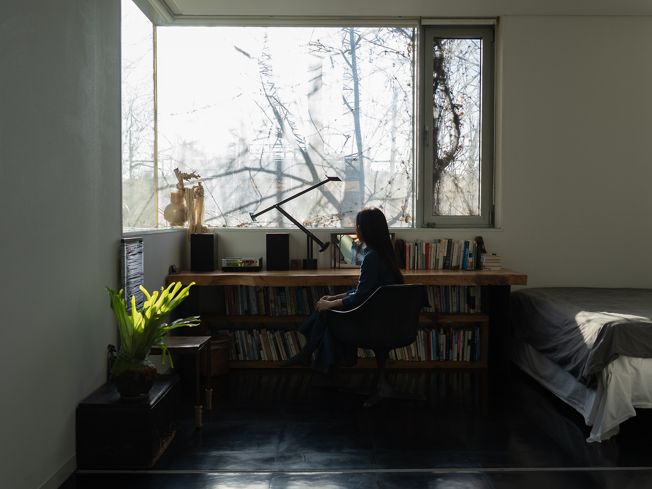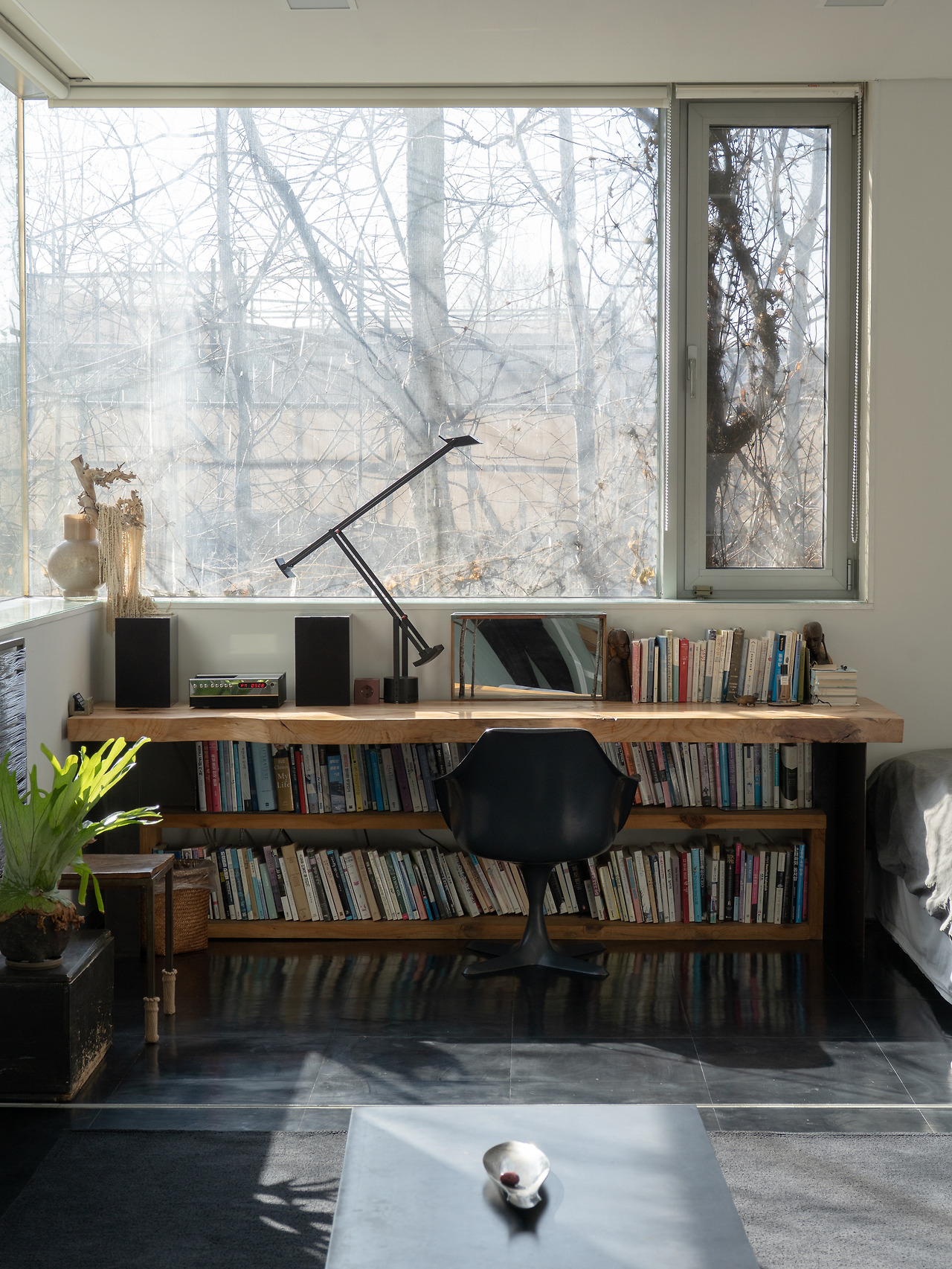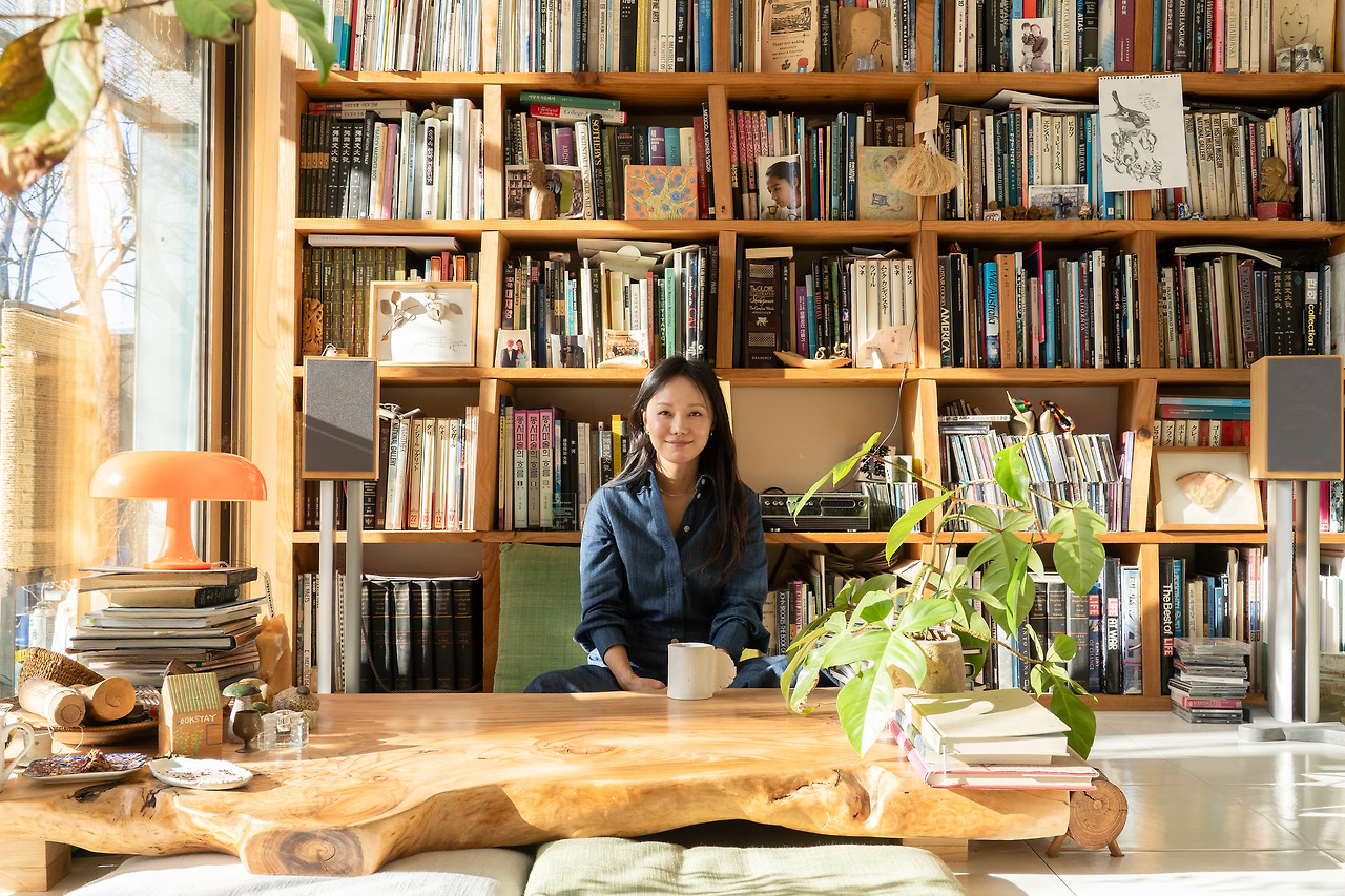 그리고 저 역시 이 공간의 영향을 많이 받고 있어요. 언제든 손을 뻗어 관심 있는 책을 꺼내 읽을 수 있고, 명상할 때 기운을 얻을 수 있는 소박한 자연도 펼쳐져 있죠. 그런 환경 덕분에 잠시 멈춰 제 자신을 돌아볼 여유를 가질 수 있어요. 저에게는 이곳이 최고의 작업 공간인 셈이죠.