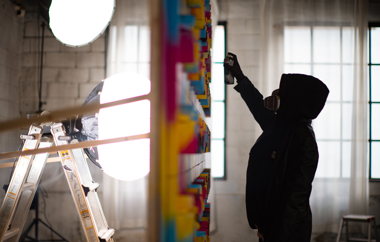 마지연: mosery는 협업 파트너를 선정할 때 두 가지 기준을 가장 중요하게 생각해요. '그 분야에서 가장 뛰어난가?', 'mosery와 조화를 이루는가?'. 여기서 뛰어나다는 건 단순히 능력의 등수를 의미하는 건 아니에요. 자신만의 독창적인 세계와 작업 방식, 그리고 영향력을 가진 아티스트인지 보는 거죠. 레오다브는 국내 대표적인 그라피티 아티스트로, '러브 까모 Love Camo'라는 독창적인 작품 스타일을 보유하고 있어요. 그뿐만 아니라 단순히 작업을 넘어 다음 세대를 위한 후학 양성에도 힘쓰는 예술가라는 점이 굉장히 인상 깊었어요. mosery가 론칭된 지 단 4개월 만에 진행된 콜라보였지만, 십자가 100개를 캔버스 삼아 하나의 거대한 작품을 만든 기획은 정말 센세이션 했죠.