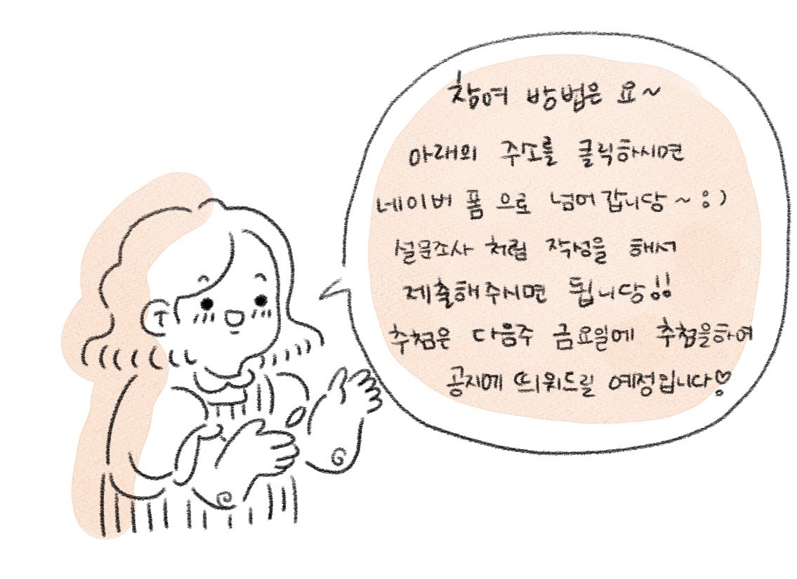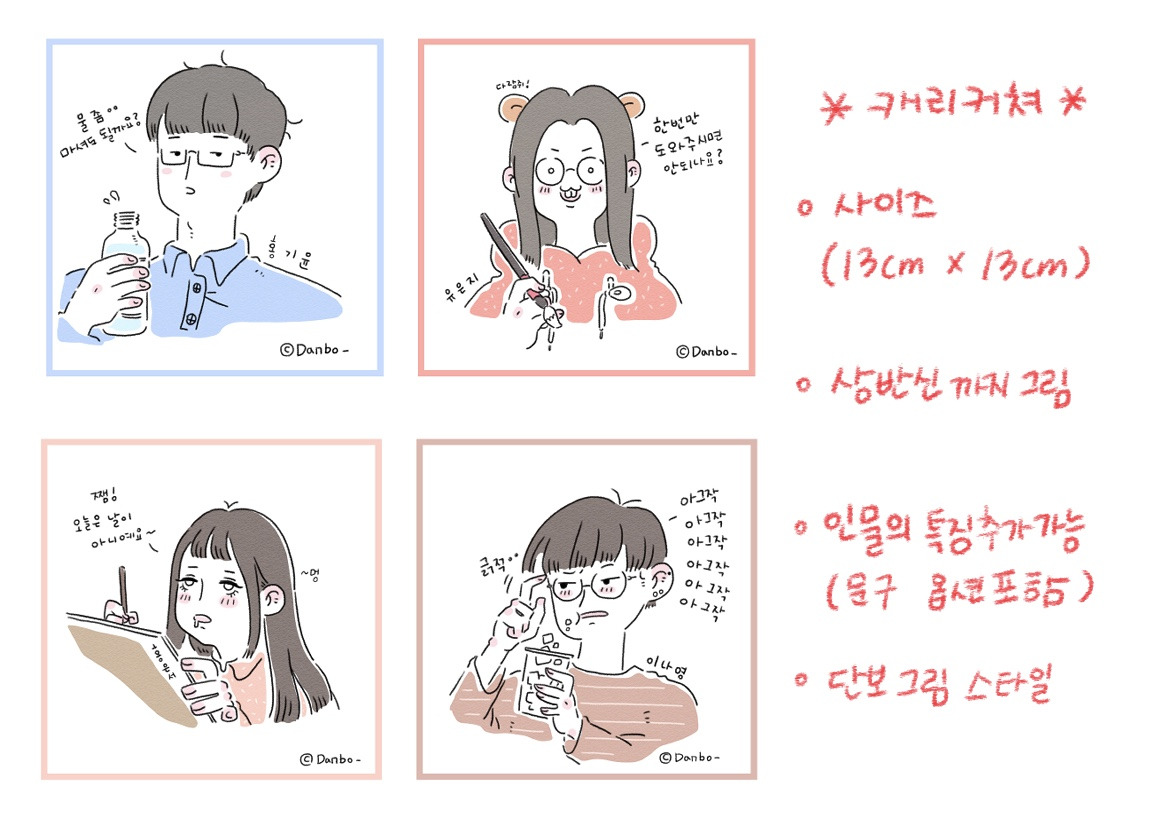 단보의 소소한 일기 1000구독자 돌파기념 안녕하세요! 단보의 소소한 일기 1000구독자 돌파기념으로 소소한 이벤트를 열었습니다! 바로! 캐리커쳐 이벤트 입니다. 캐리커쳐 제작 과정 - 아이패드로 작업 후 인쇄 하여 카드와 함께 택배로 발송해 드립니다. 참여 방법 - 설문조사지에 질의응답을 작성 합니다. - 성함과 주소를 정확히 기입해 주세요. - 추첨 결과는 23일 금요일에 합니다.[일기업로드와 함께 공지예정] - 추첨 동영상은 블로그 와 인스타에 올릴예정입니다. 많은 참여 부탁드립니다!
