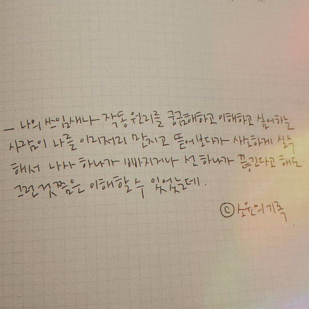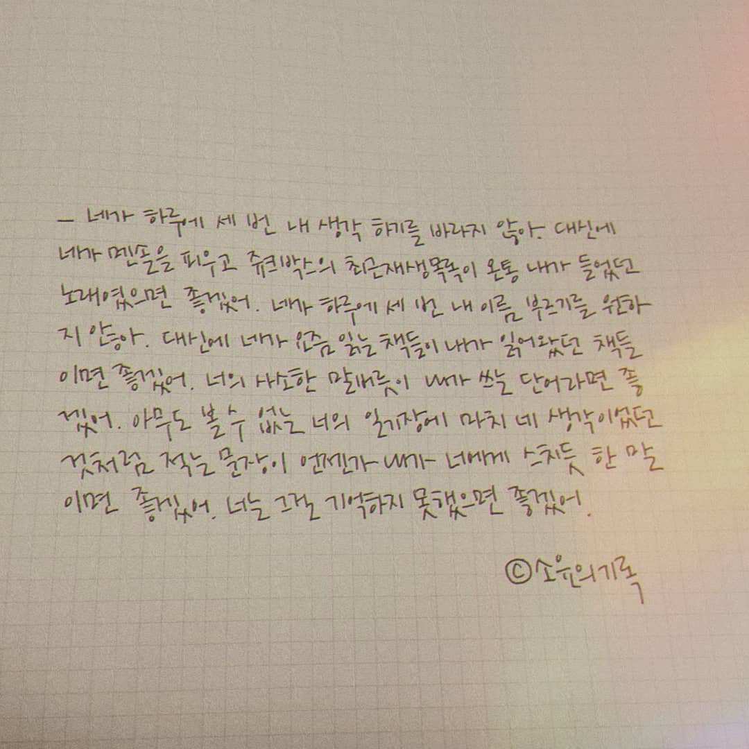 네가 하루에 세 번 내 생각 하기를 바라지 않아. 대신에 네가 멘솔을 피우고 쥬크박스의 최근 재생 목록이 온통 내가 들었던 노래였으면 좋겠어. 네가 하루에 세 번 내 이름을 부르기를 원하지 않아. 대신에 네가 요즘 읽는 책들이 내가 읽어왔던 책들이면 좋겠어. 너의 사소한 말버릇이 내가 쓰는 단어라면 좋겠어. 아무도 볼 수 없는 너의 일기장에 마치 네 생각인 것 처럼 적는 문장이 언젠가 내가 너에게 스치듯 한 말이면 좋겠어. 너는 그걸 기억하지 못 했으면 좋겠어.