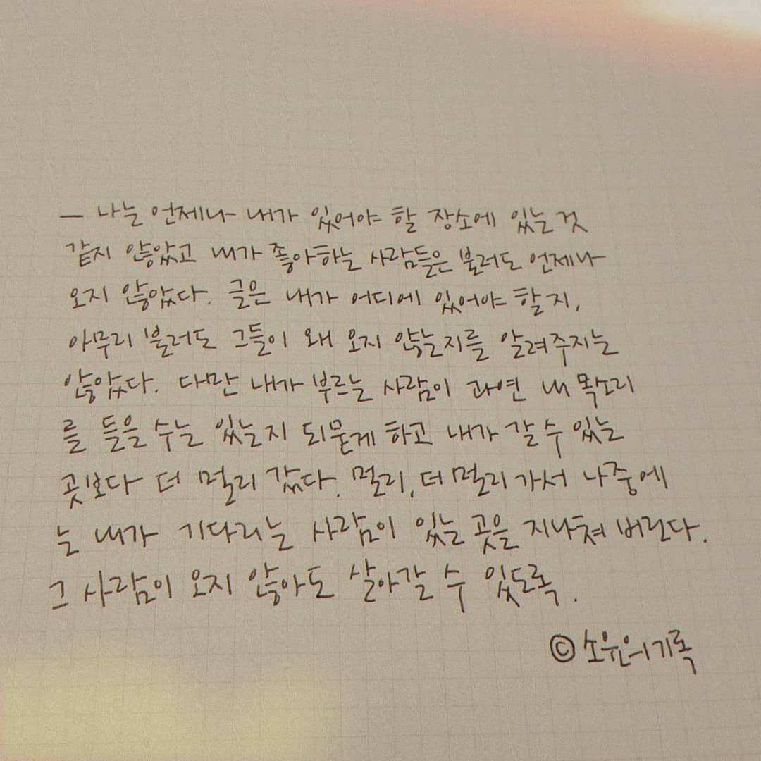 나는 언제나 내가 있어야 할 장소에 있는 것 같지 않았고 내가 좋아하는 사람들은 불러도 언제나 오지 않았다. 글은 내가 어디에 있어야 할 지, 아무리 불러도 그들이 왜 오지 않는지를 알려주지는 않았다. 다만 글은 내가 부르는 사람이 과연 내 목소리를 들을 수는 있는지 되묻게 하고 내가 갈 수 있는 곳보다 더 멀리 갔다. 멀리, 더 멀리 가서, 나중에는 내가 기다리는 사람이 있는 곳을 지나쳐 버린다. 그 사람이 오지 않아도 살아갈 수 있도록.