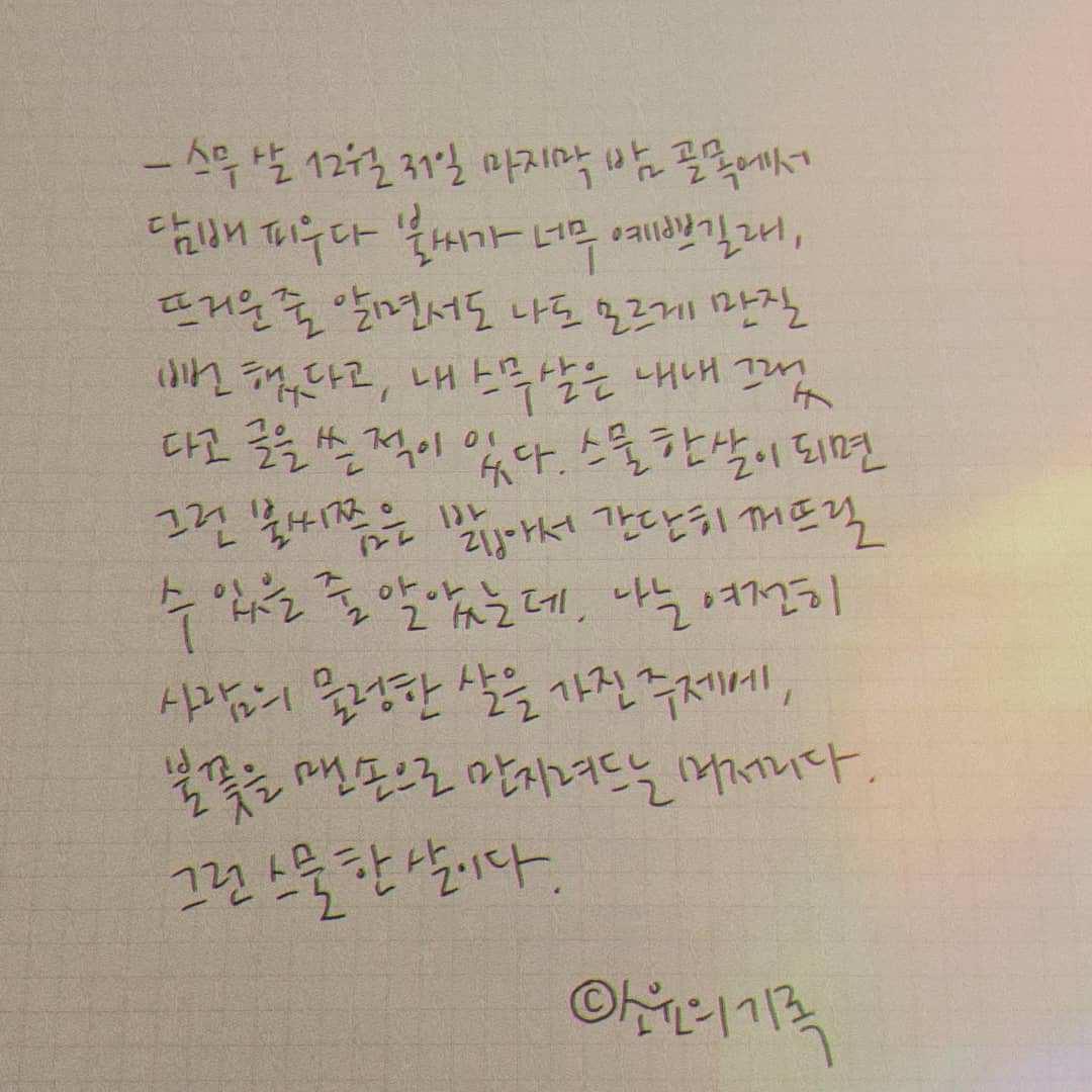 스무 살 12월 31일 마지막 밤 골목에서 담배 피우다 불씨가 너무 예쁘길래, 뜨거운 줄 알면서도 나도 모르게 만질 뻔 했다고, 내 스무 살은 내내 그랬다고 글을 쓴 적이 있다. 스물 한 살이 되면 그런 불씨쯤은 밟아서 간단히 꺼트릴 수 있을 줄 알았는데, 나늩 여전히 사람의 물렁한 살을 가진 주제에, 불꽃을 맨손으로 만지려드는 머저리다. 그런 스물 한 살이다.