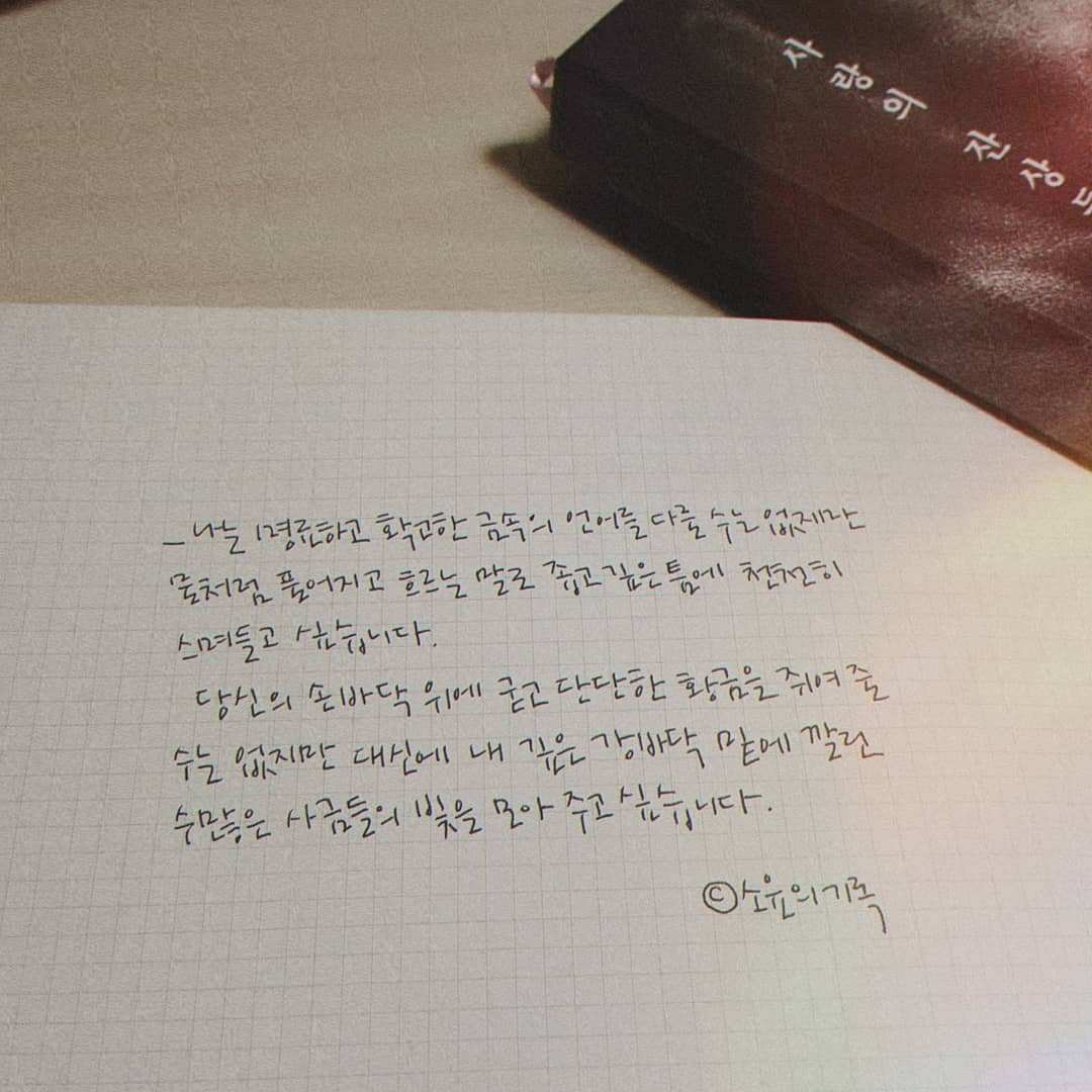 당신의 손바닥 위에 굳고 단단한 황금을 쥐여줄 수는 없지만 대신에 내 깊은 강바닥 밑에 깔린 수많은 사금들의 빛을 모아 주고 싶습니다.