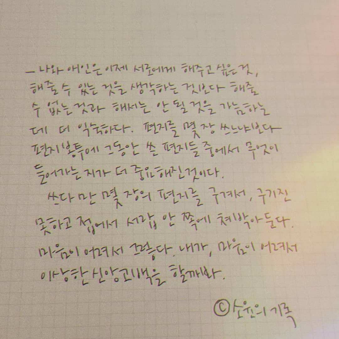 나와 애인은 이제 서로에게 해주고 싶은 것, 해줄 수 있는 것을 생각하기 보다는 해줄 수 없는 것과 해서는 안될 것을 가늠하는데 더 익숙하다. 편지를 몇 장 쓰느냐보다 편지 봉투에 그동안 쓴 편지들 중에서 무엇이 들어가는지가 더 중요한 것이다.