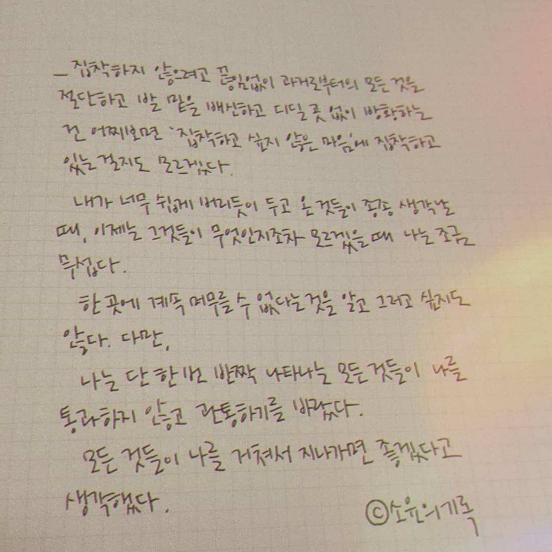 내가 너무 쉽게 버리듯이 두고 온 것들이 종종 생각날 때, 이제는 그것들이 무엇인지조차 모르겠을 때 나는 조금 무섭다.