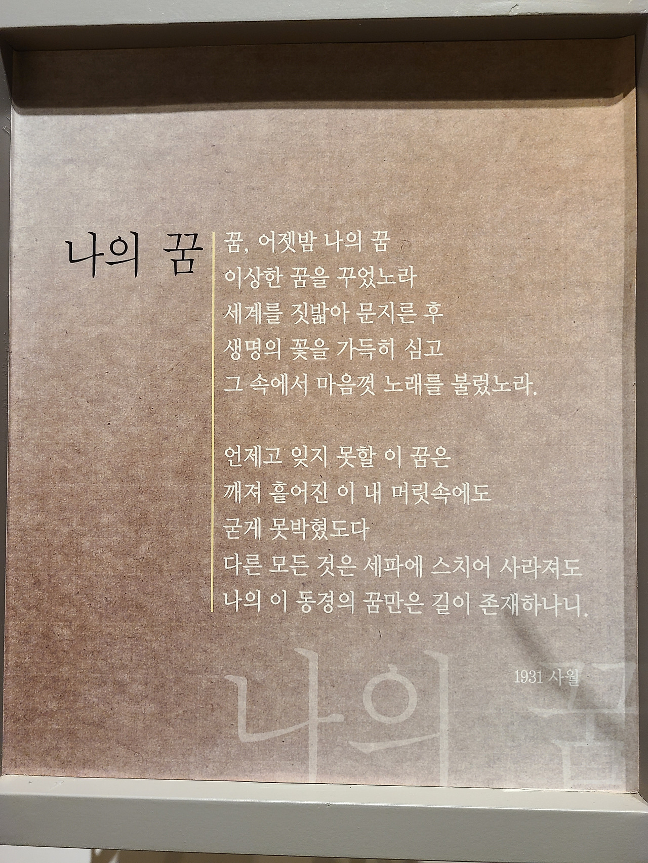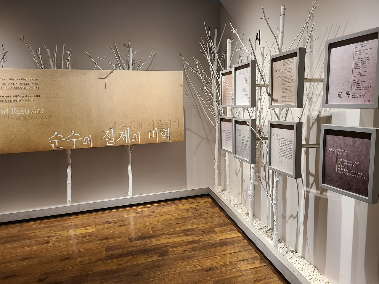 작품 전시실 입구에는 선생님의 시들과 작품세계를 간략하게 소개하는 벽이 나오는데 '순수와 절제의 미학'을 추구했던 선생님의 정신처럼 깔끔하고 담백하게 꾸며놓았다. 작가 정신이라... 우리말을 마음껏 쓰지 못하던 시절에 우리말을 가꾸고 문학으로 삶을 이야기하셨던 그 정신이 느껴진다. 아이들이 이젠 소년 소녀에 가깝게 커주어서 가능한 시간이다. 무엇보다 선생님의 시들이 몇 편 걸려있어서 발길이 거기서 멈춘다. <소나기>나 <학>, <독 짓는 늙으니> 등 소설을 지으신 분인 줄만 알았는데 시도 소설과 버금가게 많이 쓰셨다니.. 아이들은 아기자기한 조형물에 관심을 보일 때 난 그 시들을 사진에 담느라 바쁘다.