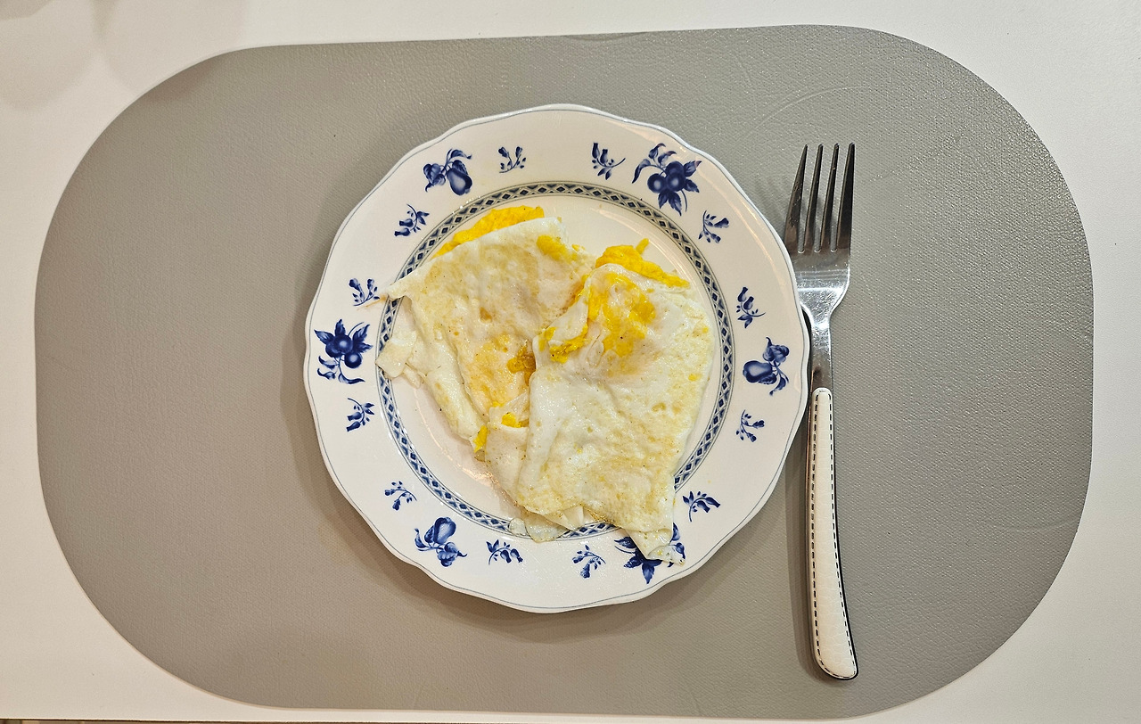 시간이 좀 여유롭고 기름기 있는 음식이 생각날 때는 달걀 프라이를 한다. 프라이팬을 달군 후 키친타올로 프라이팬을 닦는다. 오일을 붓는다. 오일이 프라이팬 전체로 퍼지도록 프라이팬을 들고 돌린다. 불을 끄고 달걀을 깨뜨린다. 다시 불을 약하게 켠다. 소금을 노른자 위에 살짝 뿌린다. 흰자가 익으면 뒤집는다. 뒤집개로 살짝 누르면 노른자가 깨져 퍼진다. 몇 번 더 뒤집어 속까지 익히면 달걀이 보들하게 완성된다. 때로는 참기름과 깨를 뿌려 고소함까지 더해서 먹기도 한다.