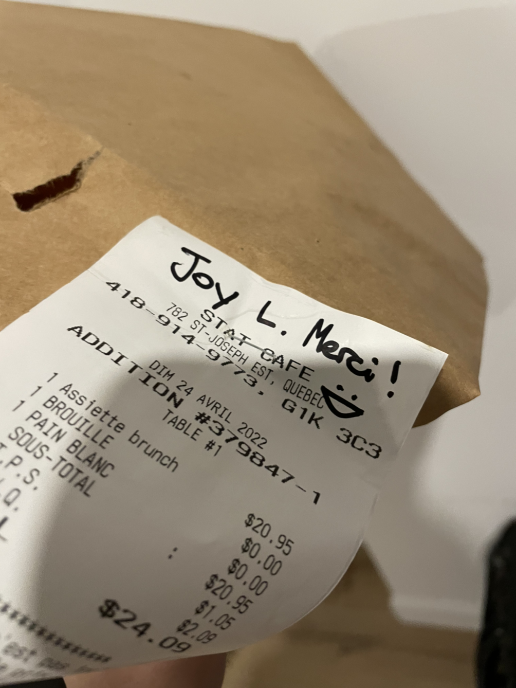 사실 이번 편은 지난 4개의 글을 통해서 캐나다 식음료 추천 관련된 내용을 나누며 약간의 식음료 편의 에필로그로 오랜만에 정보성에 초점이 둔 글이 아닌 이전의 글들처럼 수필처럼 글을 써보는 코너를 가져보려고 한다. 캐나다에 살면서 종종 음식을 배달하거나 우버 앱을 통해서 포장을 하고 매장에 가서 픽업을 해갔다. 거의 매번 그런 것은 아니지만 음식을 포장하고 있는 포장지에는 검정 혹은 다양한 색깔의 유성팬으로 내 이름과 웃는 얼굴의 캐릭터가 그려져 있었다. 가끔은 작은 흰색 영수증 위의 좁은 여백에라도 나의 영어 이름과 함께 Merci (불어로 고맙다는 의미)와 웃는 이모티콘이 그려져 있었다.