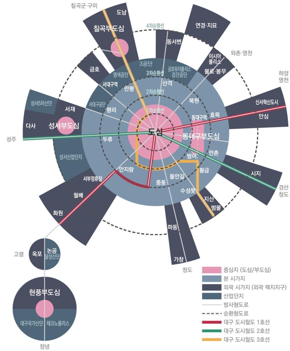 대구는 평지도시, 격자형 도로체계, 겹겹이 도시를수백년 간을 이어온 같은 자리의 도심, 동대구역 주변을 제외하곤 미약한 부도심 발전 등등 요소가 결합한 도시다. 격자형 평지도시라 교통공학적으로 지하철의 효율이 가장 안 나는 도시, 대구.