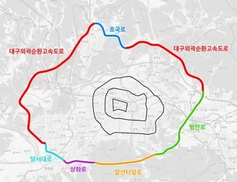 도심이 수 백년 동안 같은 곳에서 이어졌고 도심으로부터 동심원 형태로 도시가 발전해나가면서 지금 대구광역시는 1차, 2차, 3차, 4차 순환도로를 구축했다. 1환(環)부터 8환(環)까지 8개의 고리형 순환도로가 도시를 겹겹이 싸고 있는 베이징과 비슷한 구조다. 또 한 편으로는 여러개의 loop과 beltway가 둘러싸는 미국 도시 같은 측면도 있다.
