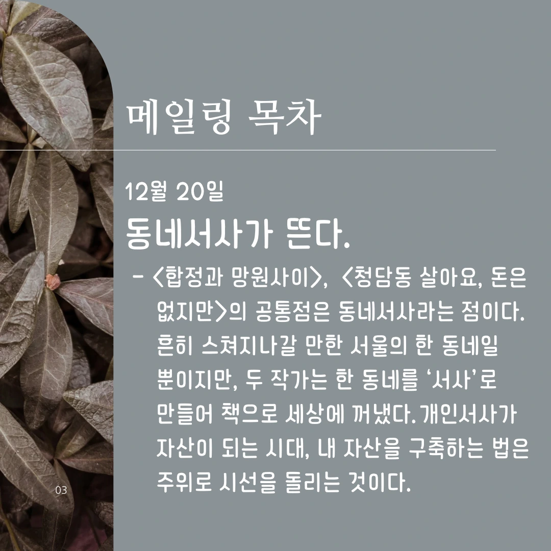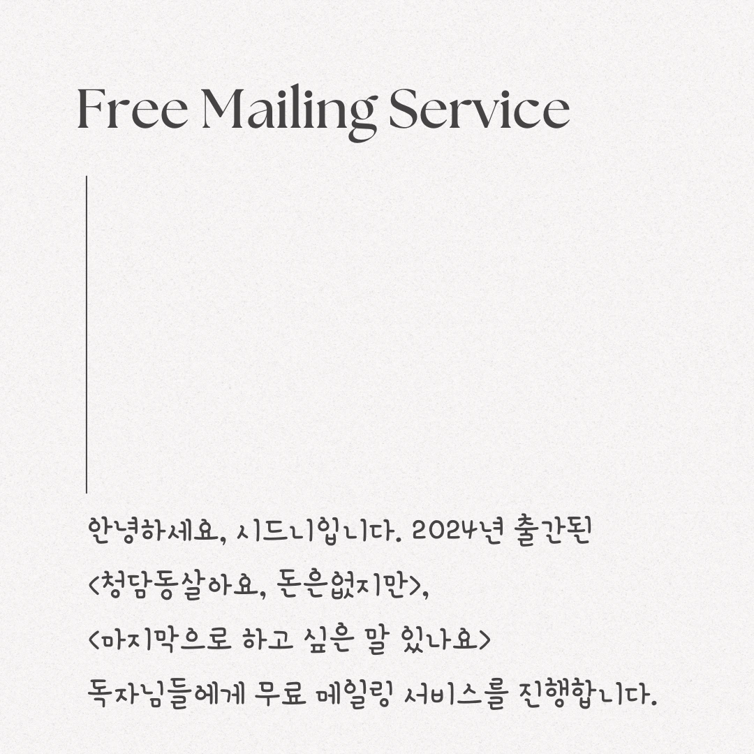 <청담동 살아요, 돈은 없지만> 또는 <마지막으로 하고 싶은 말 있나요>를 구매해주신 독자님 (또는 동네도서관에 신청해주신 분) 에게 12월 매주 금요일 메일링 서비스를 제공해드리려고 합니다.
