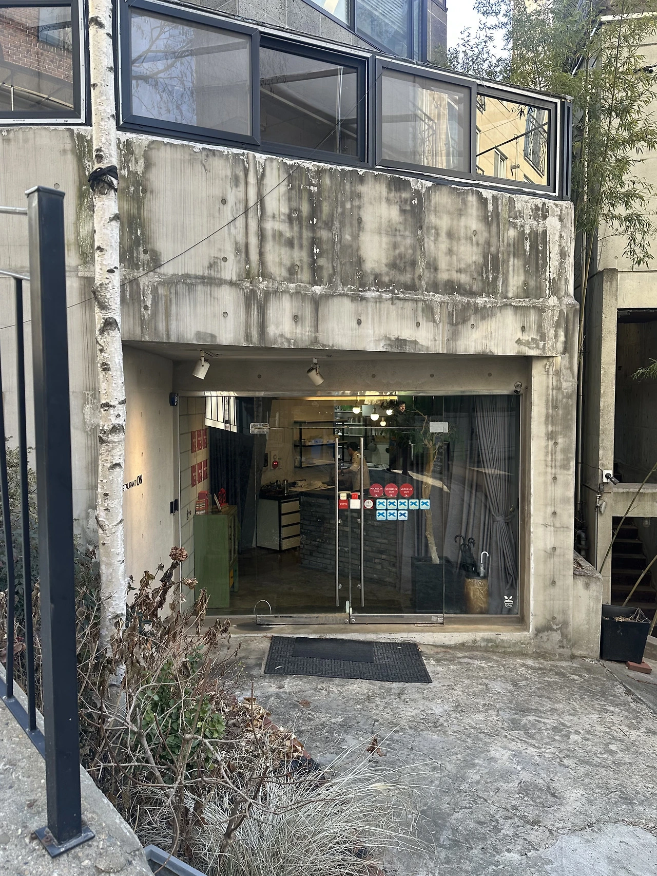 지도앱을 보니 거의 식당에 도착한 듯 보였다. 그런데 식당 간판이 있는 건물로 다가가니 1층 식당에 불이 꺼져있고 사람이 아무도 없다. 예약금까지 내놓았는데 식당이 없는게 말이 안되는 것 같아 요리조리 둘러보니 건물 옆 낭떠러지 같은 비탈길 옆에 미슐랭과 블루리본 마크가 보인다. 여기에 식당이 있다니. 아마 패션센스 좋은 회사 동료는 자신의 멋진 대형SUV를 끌고 왔다가 기함을 하며 돌아갔을지도 모른다.