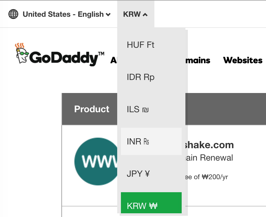 GoDaddy 체크아웃 화면에서 결제 통화를 바꿀 수 있는 기능은 사이트 왼쪽 상단에 있습니다.