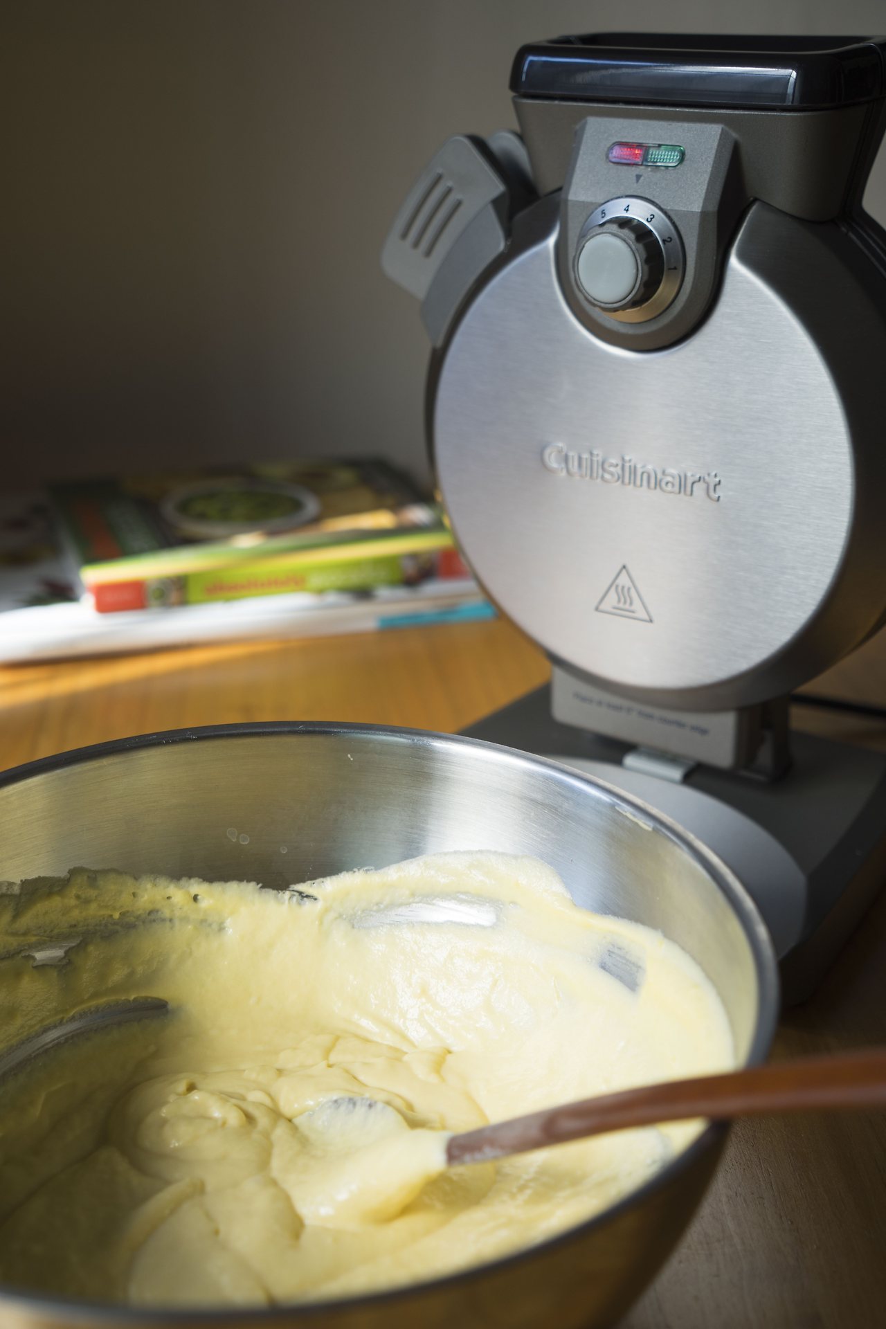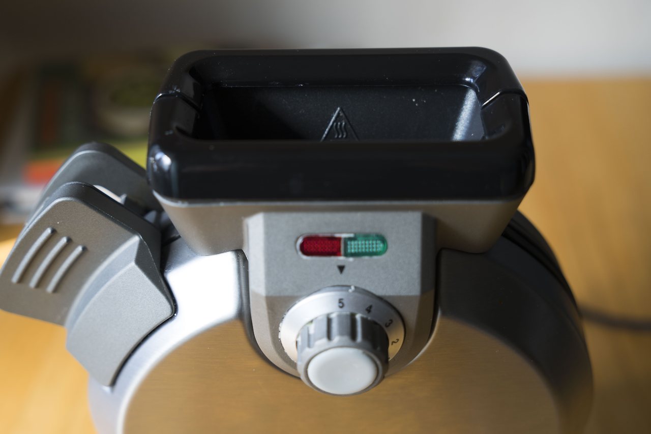 거품기로 잘 저어준 반죽은 이제 와플 기계로 들어갈 준비가 완료되었습니다. 참고로 위에 적어 놓은 반죽은 와플 믹스 뒷면에 적혀진 기준이고, 저는 조금 더 묽게 하기 위해 우유를 조금 더 넣어주었고, 소금도 살짝 첨가했습니다. 이제 삐~ 소리로 예열이 준비가 되었다는 신호를 듣고, 와플 반죽을 넣어줍니다. 이 기계는 이렇게 위에서 부어주는 스타일의 기계이네요.
